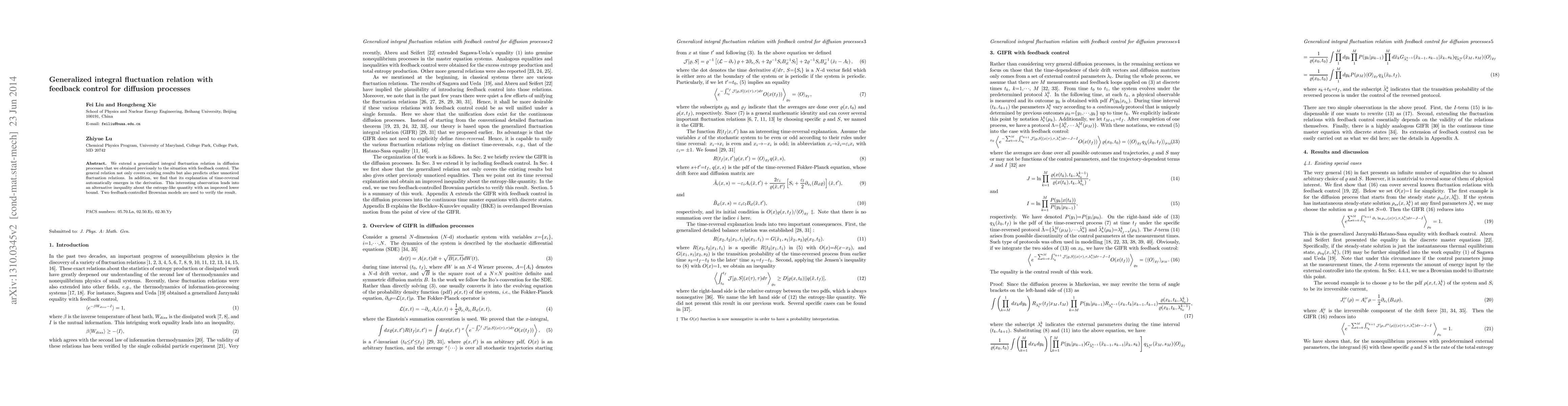 This paper extends a generalized integral fluctuation relation for diffusion processes to include feedback control, predicting new fluctuation relations and improving the understanding of time-reversal. The study also derives an alternative inequality with an enhanced lower bound for an entropy-like quantity, validated through two feedback-controlled Brownian models.