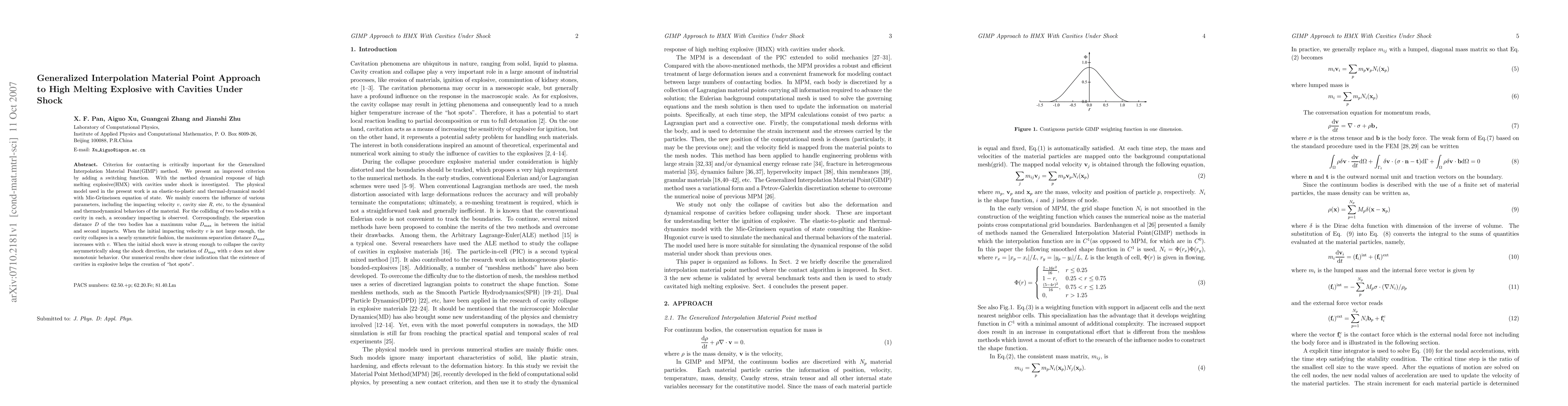 Criterion for contacting is critically important for the Generalized Interpolation Material Point(GIMP) method. We present an improved criterion by adding a switching function. With the method dynamical response of high melting explosive(HMX) with cavities under shock is investigated. The physical model used in the present work is an elastic-to-plastic and thermal-dynamical model with Mie-Gr\"uneissen equation of state. We mainly concern the influence of various parameters, including the impacting velocity $v$, cavity size $R$, etc, to the dynamical and thermodynamical behaviors of the material. For the colliding of two bodies with a cavity in each, a secondary impacting is observed. Correspondingly, the separation distance $D$ of the two bodies has a maximum value $D_{\max}$ in between the initial and second impacts. When the initial impacting velocity $v$ is not large enough, the cavity collapses in a nearly symmetric fashion, the maximum separation distance $D_{\max}$ increases with $v$. When the initial shock wave is strong enough to collapse the cavity asymmetrically along the shock direction, the variation of $D_{\max}$ with $v$ does not show monotonic behavior. Our numerical results show clear indication that the existence of cavities in explosive helps the creation of ``hot spots''.