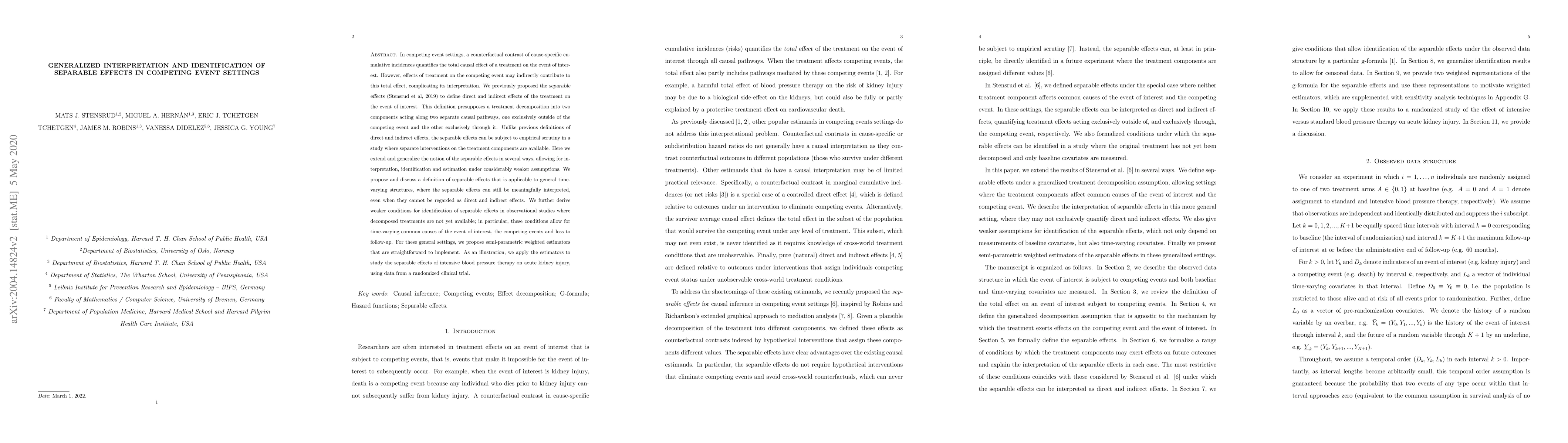 In competing event settings, a counterfactual contrast of cause-specific cumulative incidences quantifies the total causal effect of a treatment on the event of interest. However, effects of treatment on the competing event may indirectly contribute to this total effect, complicating its interpretation. We previously proposed the separable effects (Stensrud et al, 2019) to define direct and indirect effects of the treatment on the event of interest. This definition presupposes a treatment decomposition into two components acting along two separate causal pathways, one exclusively outside of the competing event and the other exclusively through it. Unlike previous definitions of direct and indirect effects, the separable effects can be subject to empirical scrutiny in a study where separate interventions on the treatment components are available. Here we extend and generalize the notion of the separable effects in several ways, allowing for interpretation, identification and estimation under considerably weaker assumptions. We propose and discuss a definition of separable effects that is applicable to general time-varying structures, where the separable effects can still be meaningfully interpreted, even when they cannot be regarded as direct and indirect effects. We further derive weaker conditions for identification of separable effects in observational studies where decomposed treatments are not yet available; in particular, these conditions allow for time-varying common causes of the event of interest, the competing events and loss to follow-up. For these general settings, we propose semi-parametric weighted estimators that are straightforward to implement. As an illustration, we apply the estimators to study the separable effects of intensive blood pressure therapy on acute kidney injury, using data from a randomized clinical trial.