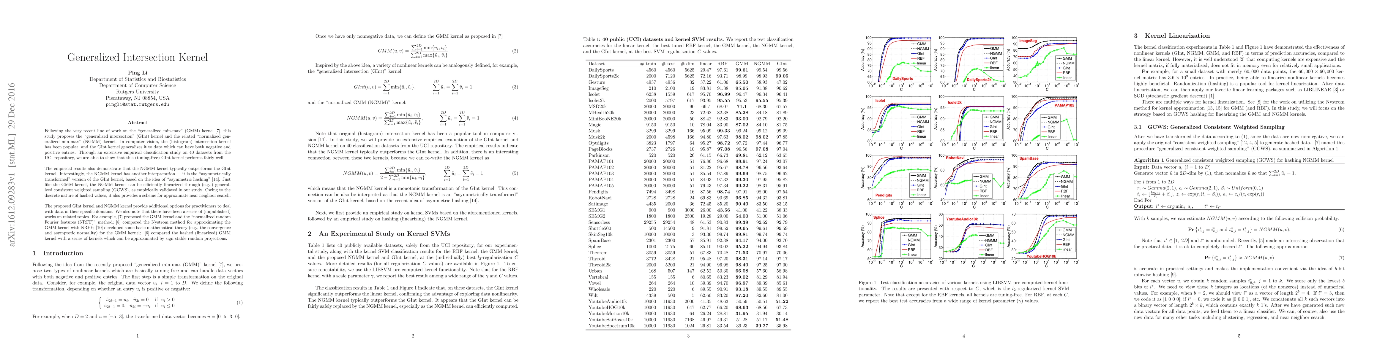 Following the very recent line of work on the ``generalized min-max'' (GMM) kernel, this study proposes the ``generalized intersection'' (GInt) kernel and the related ``normalized generalized min-max'' (NGMM) kernel. In computer vision, the (histogram) intersection kernel has been popular, and the GInt kernel generalizes it to data which can have both negative and positive entries. Through an extensive empirical classification study on 40 datasets from the UCI repository, we are able to show that this (tuning-free) GInt kernel performs fairly well. The empirical results also demonstrate that the NGMM kernel typically outperforms the GInt kernel. Interestingly, the NGMM kernel has another interpretation --- it is the ``asymmetrically transformed'' version of the GInt kernel, based on the idea of ``asymmetric hashing''. Just like the GMM kernel, the NGMM kernel can be efficiently linearized through (e.g.,) generalized consistent weighted sampling (GCWS), as empirically validated in our study. Owing to the discrete nature of hashed values, it also provides a scheme for approximate near neighbor search.