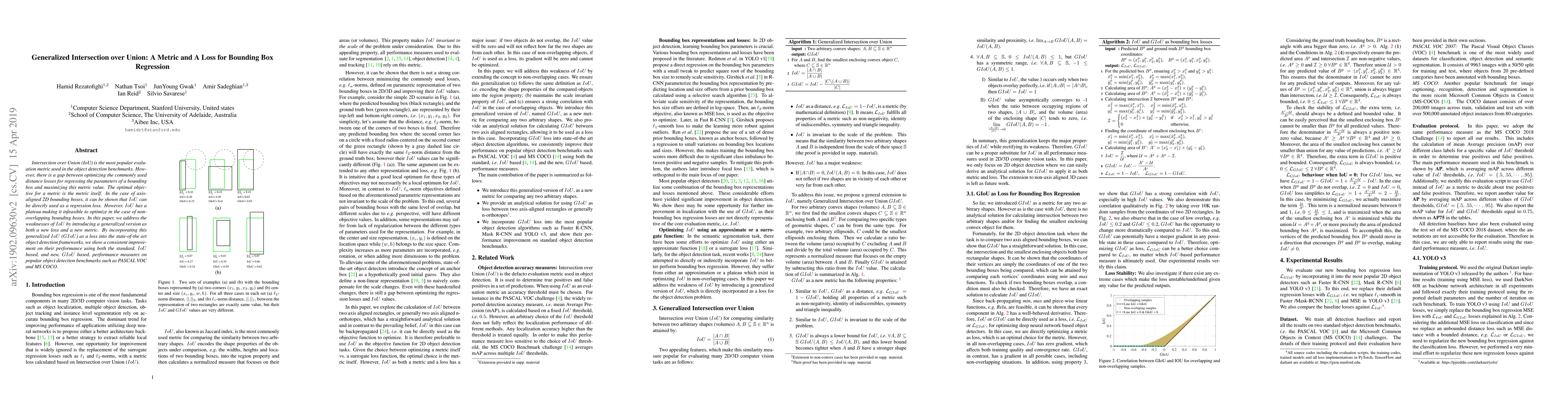 This paper introduces Generalized Intersection over Union (GIoU) as both a new metric and loss function to improve bounding box regression in object detection. It addresses the plateau issue of traditional IoU, leading to consistent performance improvements on benchmarks like PASCAL VOC and MS COCO.