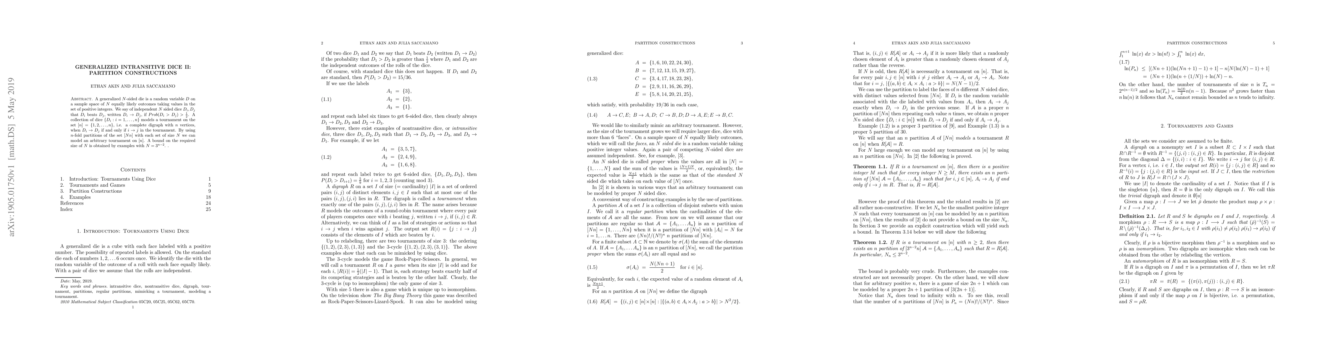 This paper explores generalized intransitive dice constructions using $n$-fold partitions to model arbitrary tournaments on a set of $n$ vertices, where $N$-sided dice compete based on probabilistic outcomes. The authors demonstrate that a tournament can be represented with dice of size $N = 3^{n-2}$.