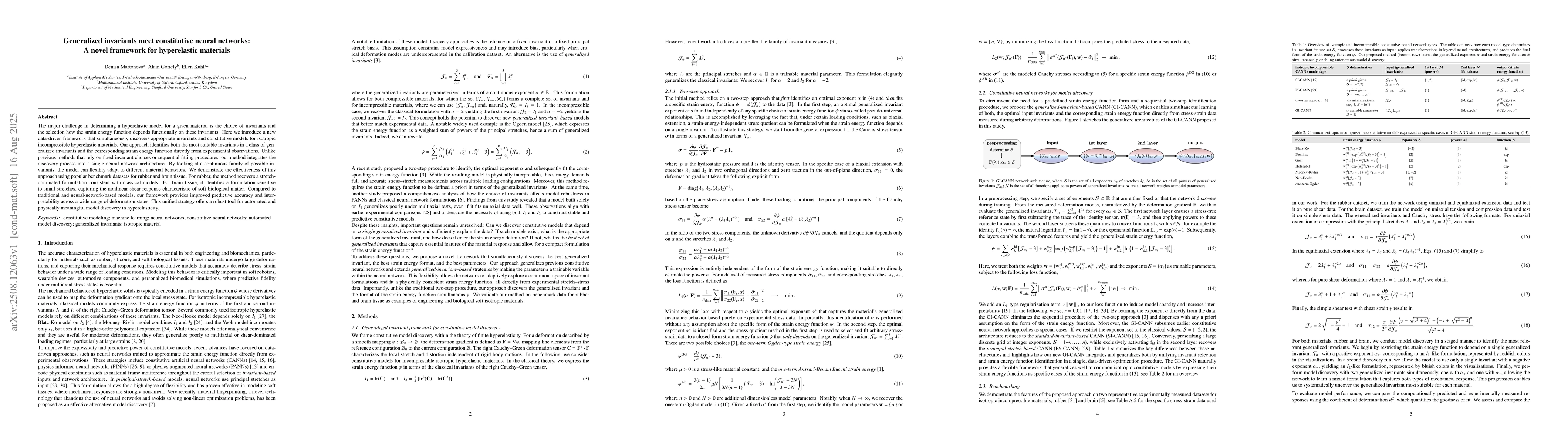 The major challenge in determining a hyperelastic model for a given material is the choice of invariants and the selection how the strain energy function depends functionally on these invariants. Here we introduce a new data-driven framework that simultaneously discovers appropriate invariants and constitutive models for isotropic incompressible hyperelastic materials. Our approach identifies both the most suitable invariants in a class of generalized invariants and the corresponding strain energy function directly from experimental observations. Unlike previous methods that rely on fixed invariant choices or sequential fitting procedures, our method integrates the discovery process into a single neural network architecture. By looking at a continuous family of possible invariants, the model can flexibly adapt to different material behaviors. We demonstrate the effectiveness of this approach using popular benchmark datasets for rubber and brain tissue. For rubber, the method recovers a stretch-dominated formulation consistent with classical models. For brain tissue, it identifies a formulation sensitive to small stretches, capturing the nonlinear shear response characteristic of soft biological matter. Compared to traditional and neural-network-based models, our framework provides improved predictive accuracy and interpretability across a wide range of deformation states. This unified strategy offers a robust tool for automated and physically meaningful model discovery in hyperelasticity.