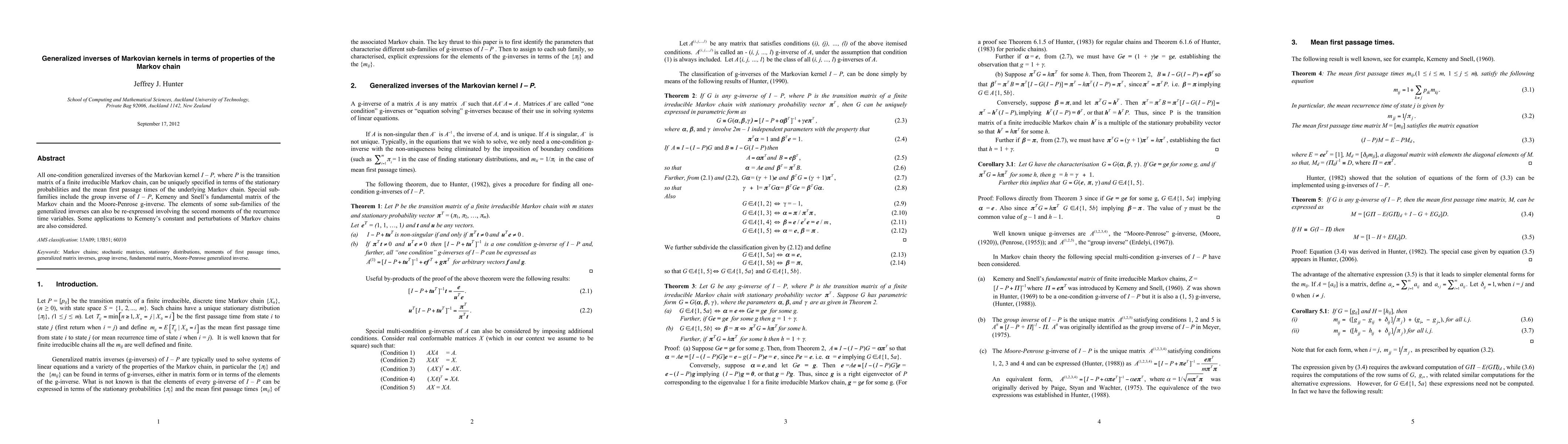 This paper explores the unique specification of generalized inverses of Markovian kernels in relation to the stationary probabilities and mean first passage times of a finite irreducible Markov chain, including special cases like the group inverse and Moore-Penrose g-inverse. Applications to Kemeny's constant and Markov chain perturbations are also discussed.