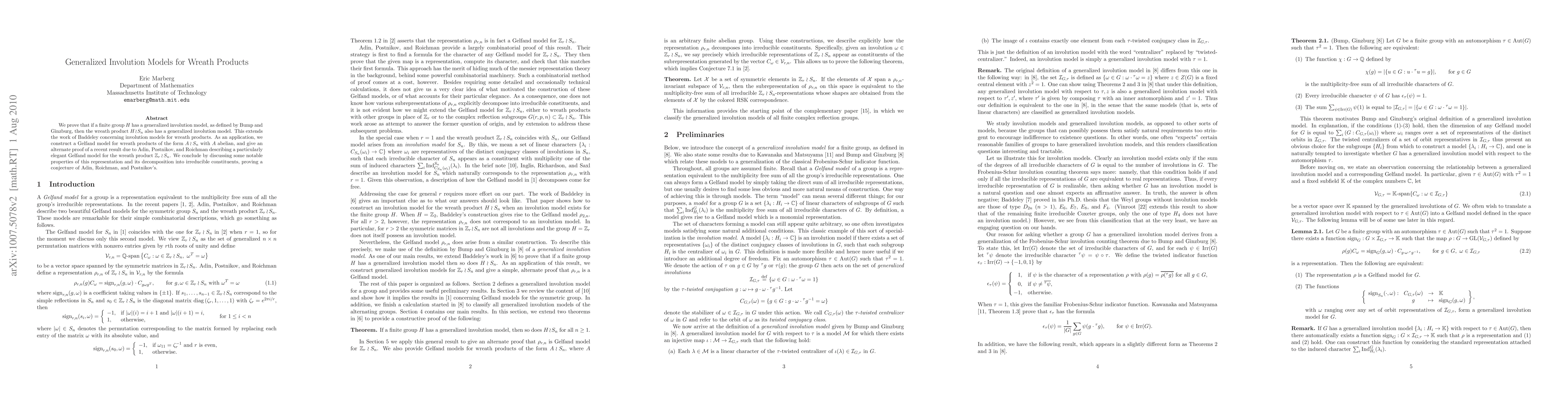 This paper extends the existence of generalized involution models to wreath products $H \wr S_n$ when $H$ possesses such a model, thereby generalizing Baddeley's results. It also constructs Gelfand models for specific wreath products and verifies a conjecture about their irreducible decompositions.