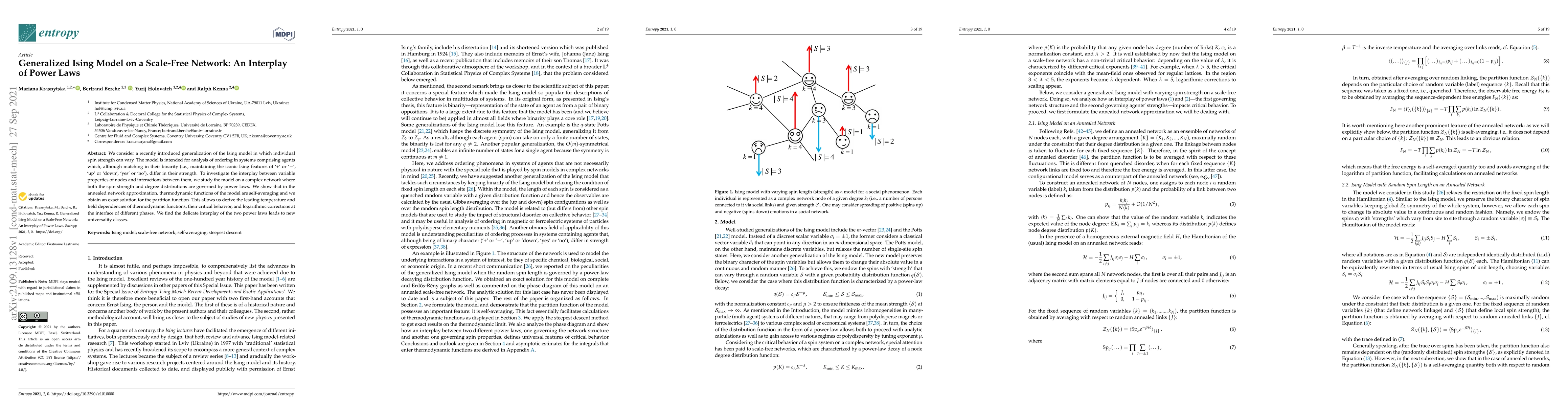We consider a recently introduced generalization of the Ising model in which individual spin strength can vary. The model is intended for analysis of ordering in systems comprising agents which, although matching in their binarity (i.e., maintaining the iconic Ising features of `+' or `$-$', `up' or `down', `yes' or `no'), differ in their strength. To investigate the interplay between variable properties of nodes and interactions between them, we study the model on a complex network where both the spin strength and degree distributions are governed by power laws. We show that in the annealed network approximation, thermodynamic functions of the model are self-averaging and we obtain an exact solution for the partition function. This allows us to derive the leading temperature and field dependencies of thermodynamic functions, their critical behavior, and logarithmic corrections at the interface of different phases. We find the delicate interplay of the two power laws leads to new universality classes.