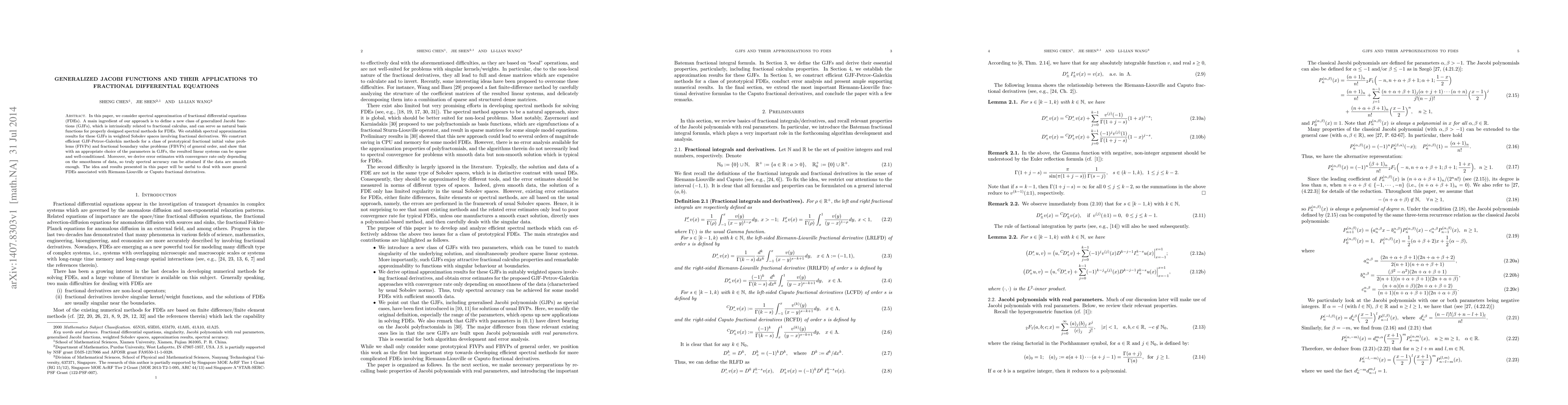 This paper introduces generalized Jacobi functions (GJFs) as basis functions for spectral methods to solve fractional differential equations (FDEs). The authors establish spectral approximation results and construct efficient GJF-Petrov-Galerkin methods, demonstrating spectral accuracy and sparsity in linear systems.