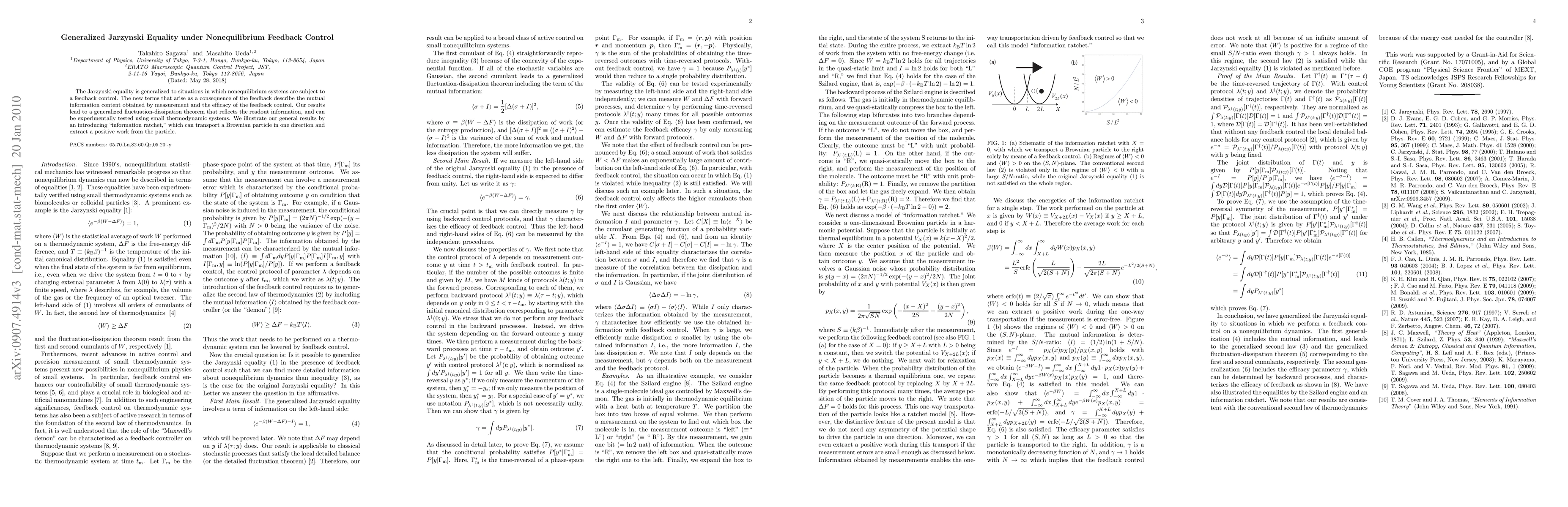 The research generalizes the Jarzynski equality to nonequilibrium systems under feedback control, introducing terms for mutual information and feedback efficacy, leading to a new fluctuation-dissipation theorem that incorporates readout information, and experimentally demonstrated by an "information ratchet" that drives a Brownian particle in one direction while extracting positive work.