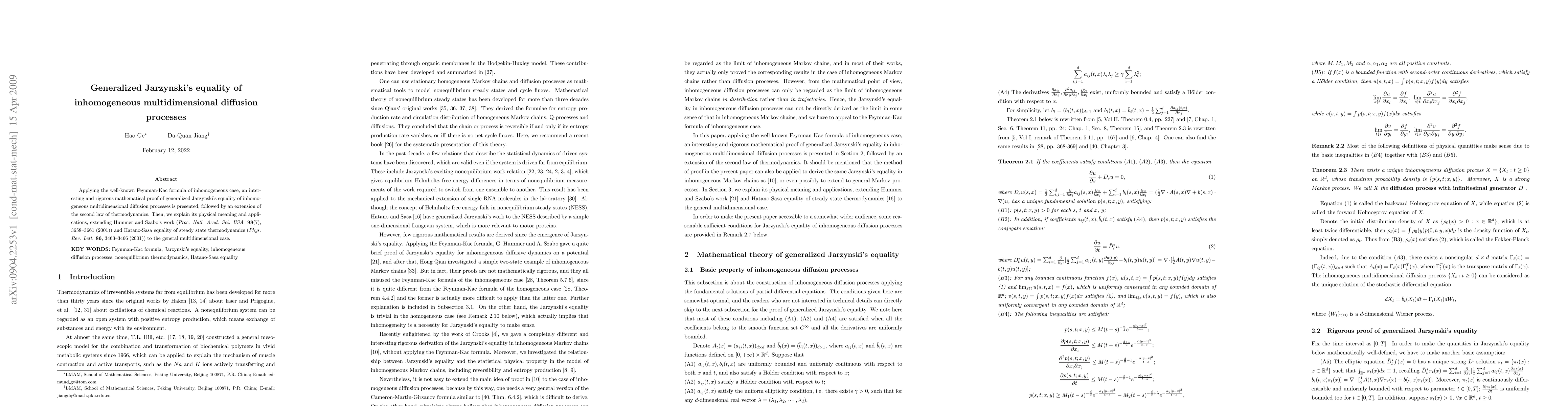 Applying the well-known Feynman-Kac formula of inhomogeneous case, an interesting and rigorous mathematical proof of generalized Jarzynski's equality of inhomogeneous multidimensional diffusion processes is presented, followed by an extension of the second law of thermodynamics. Then, we explain its physical meaning and applications, extending Hummer and Szabo's work ({\em Proc. Natl. Acad. Sci. USA} {\bf 98}(7), 3658--3661 (2001)) and Hatano-Sasa equality of steady state thermodynamics ({\em Phys. Rev. Lett.} {\bf 86}, 3463--3466 (2001)) to the general multidimensional case.