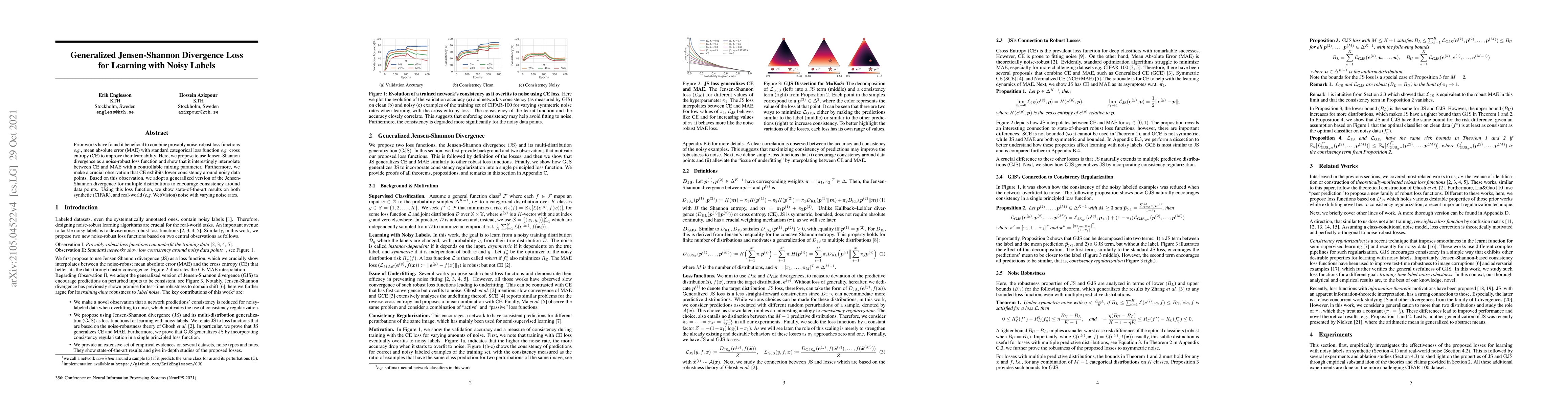 This paper proposes a generalized Jensen-Shannon divergence loss that interpolates between cross entropy and mean absolute error, offering noise robustness. It demonstrates state-of-the-art performance on both synthetic and real-world noisy datasets by encouraging consistency around noisy data points.