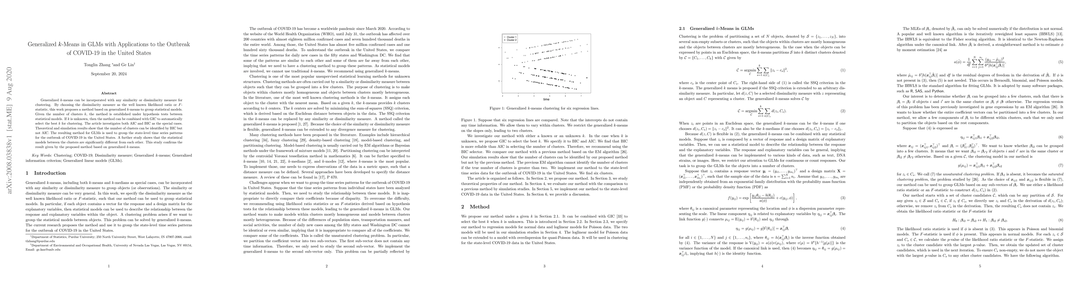 This paper proposes a method combining generalized k-means with Generalized Likelihood Ratio (GLR) to identify clusters in statistical models applied to the COVID-19 outbreak in the US. The method effectively groups state-level time series patterns, showing significantly different statistical models between clusters.