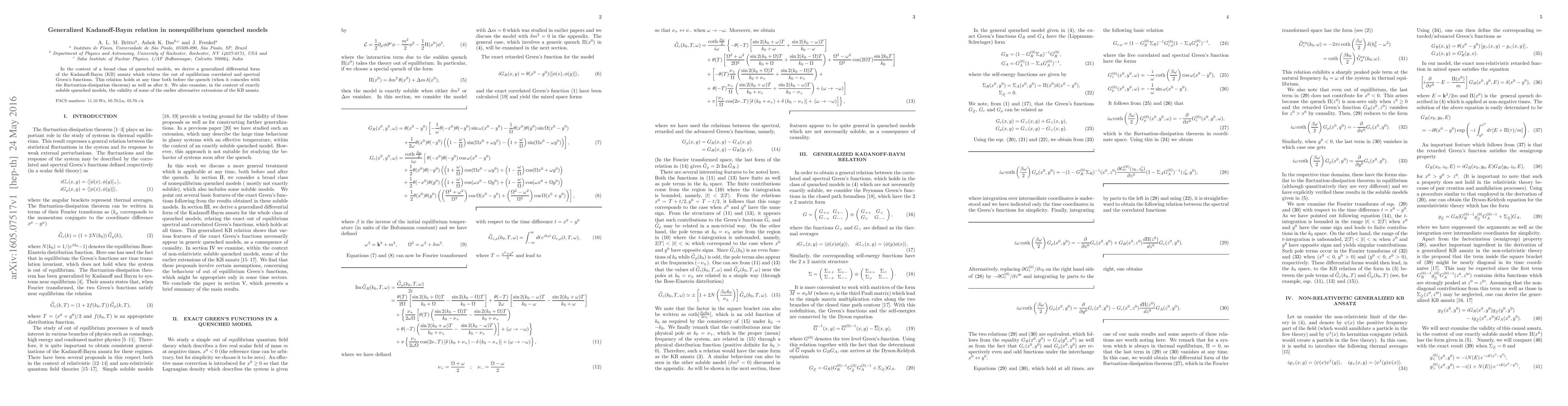 In the context of a broad class of quenched models, we derive a generalized differential form of the Kadanoff-Baym (KB) ansatz which relates the out of equilibrium correlated and spectral Green's functions. This relation holds at any time both before the quench (when it coincides with the fluctuation-dissipation theorem) as well as after it. We also examine, in the context of exactly soluble quenched models, the validity of some of the earlier alternative extensions of the KB ansatz.
