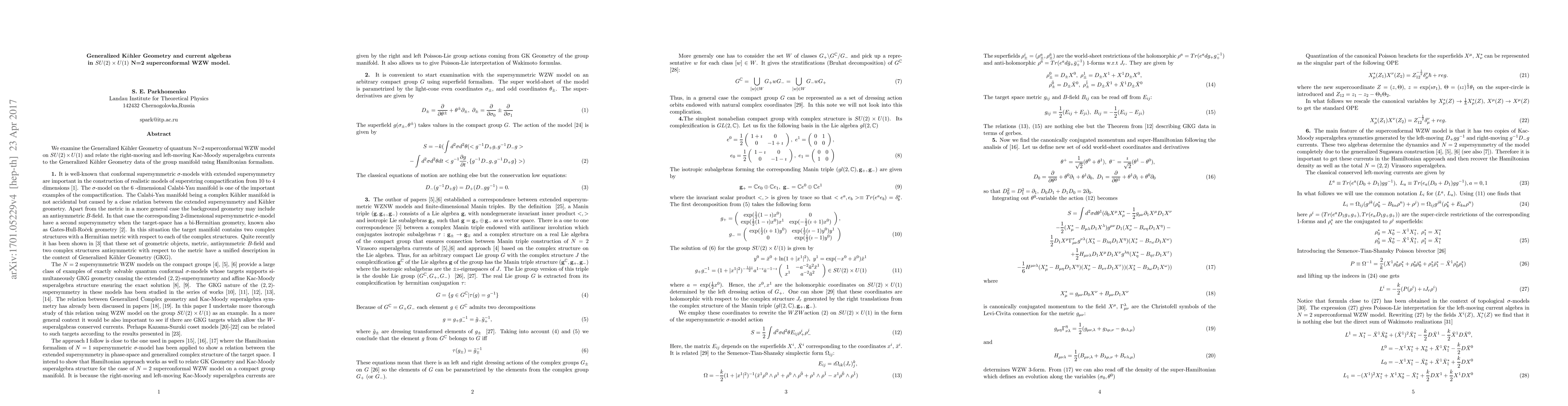 Summary: This paper investigates the Generalized Kähler Geometry of the N=2 superconformal Wess-Zumino-Witten (WZW) model on the $SU(2)\times U(1)$ group manifold, connecting the Kac-Moody superalgebra currents to the geometry using a Hamiltonian formalism. The study employs advanced mathematical tools to understand the underlying structure of the model.