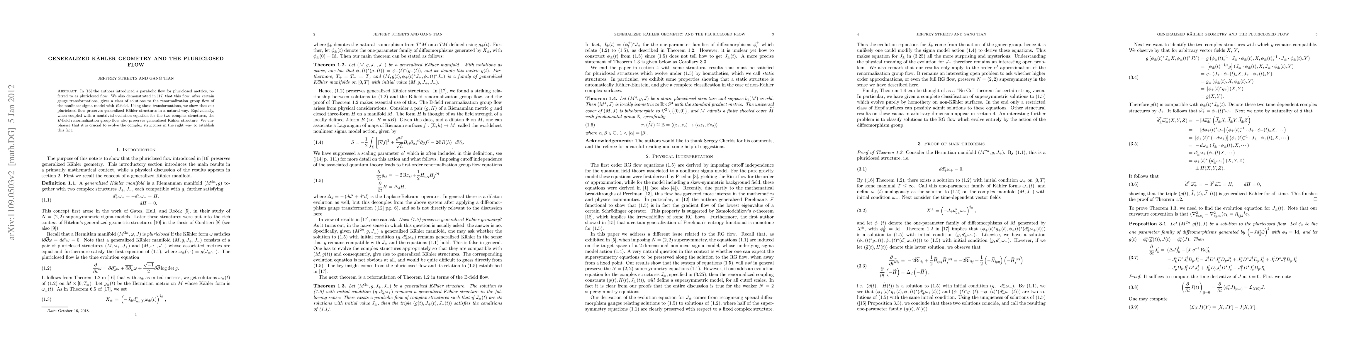 This paper explores the pluriclosed flow, a parabolic flow for pluriclosed metrics, and its connection to the renormalization group flow of the nonlinear sigma model with B-field. The authors demonstrate that this flow preserves generalized Kahler structures when the complex structures are evolved appropriately.