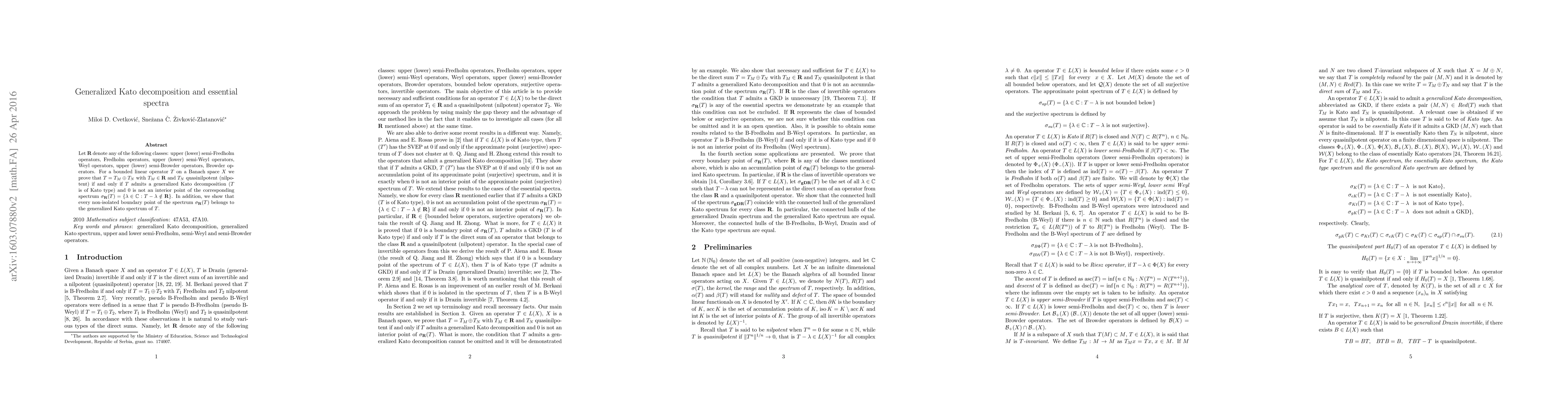 Let ${\bf R}$ denote any of the following classes: upper (lower) semi-Fredholm operators, Fredholm operators, upper (lower) semi-Weyl operators, Weyl operators, upper (lower) semi-Browder operators, Browder operators. For a bounded linear operator $T$ on a Banach space $X$ we prove that $T=T_M\oplus T_N$ with $T_M \in {\bf R}$ and $T_N$ quasinilpotent (nilpotent) if and only if $T$ admits a generalized Kato decomposition ($T$ is of Kato type) and $0$ is not an interior point of the corresponding spectrum $\sigma_{\bf R}(T)=\{\lambda \in \mathbb{C}: T-\lambda \notin {\bf R}\}$. In addition, we show that every non-isolated boundary point of the spectrum $\sigma_{\bf R}(T)$ belongs to the generalized Kato spectrum of $T$.