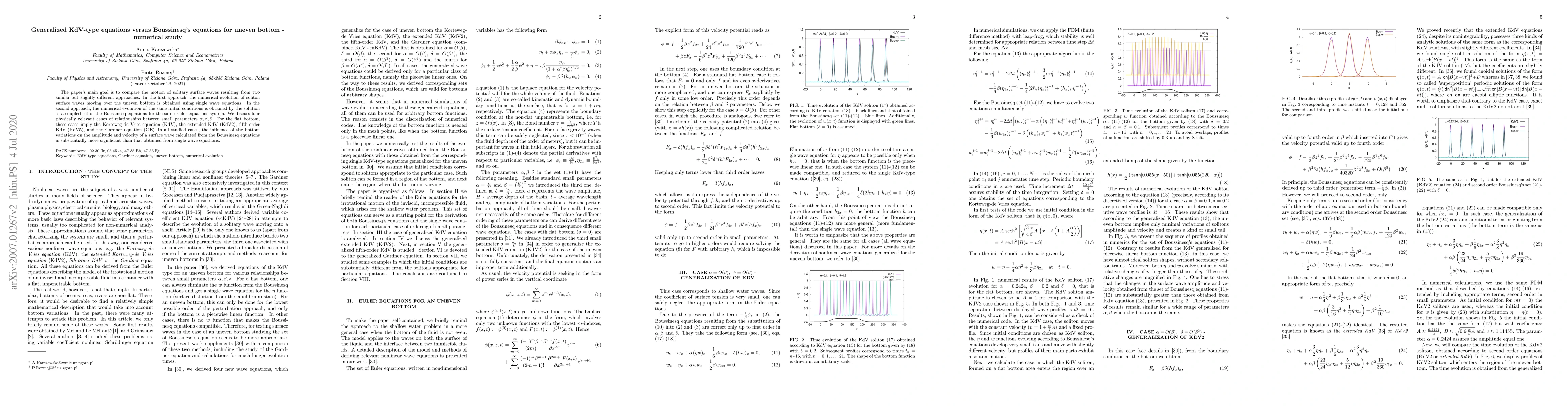 This paper compares the numerical evolution of solitary surface waves over uneven bottoms using generalized KdV-type equations and Boussinesq's equations, finding that the latter more significantly affects wave amplitude and velocity. The study examines four cases relating to KdV, extended KdV, fifth-order KdV, and Gardner equations.