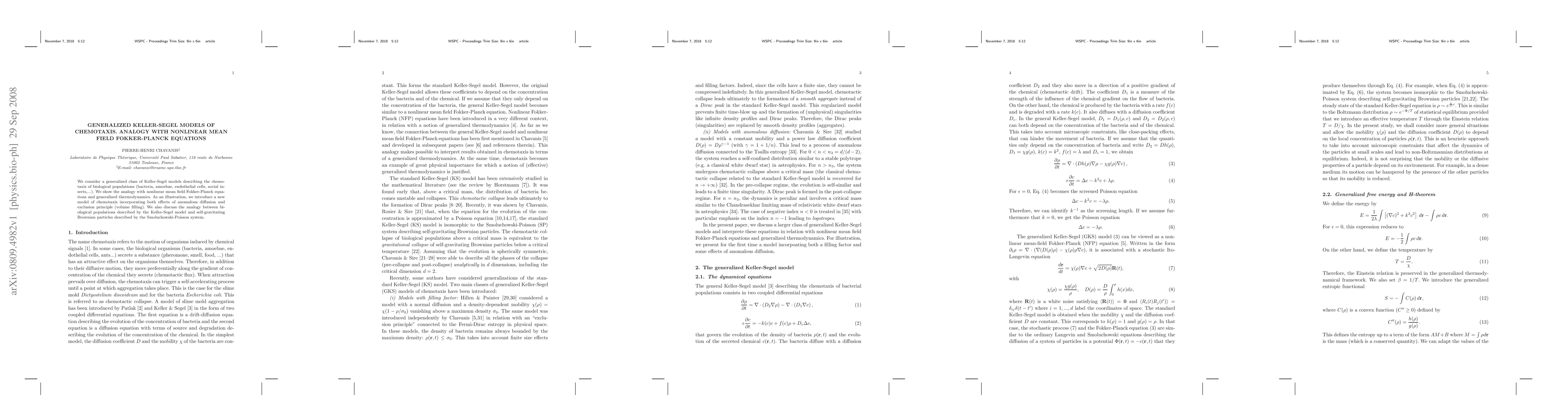 This paper explores generalized Keller-Segel models for chemotaxis, revealing their analogy with nonlinear mean field Fokker-Planck equations and generalized thermodynamics. It introduces a new model incorporating anomalous diffusion and exclusion principle, and discusses parallels with the Smoluchowski-Poisson system for self-gravitating Brownian particles.