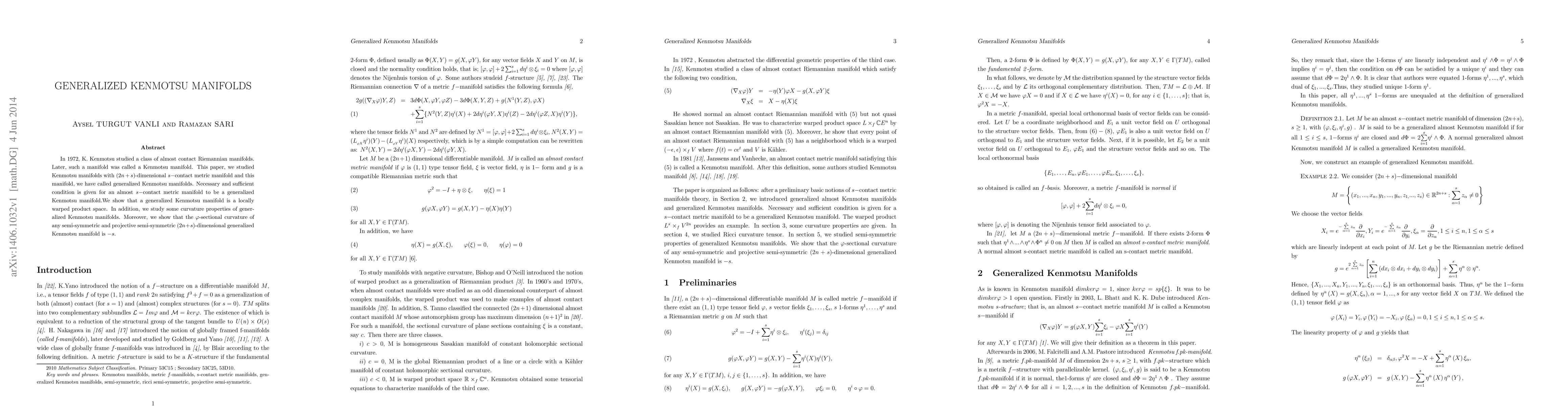 In 1972, K. Kenmotsu studied a class of almost contact Riemannian manifolds. Later, such a manifold was called a Kenmotsu manifold. This paper, we studied Kenmotsu manifolds with $(2n+s)$-dimensional $s-$contact metric manifold and this manifold, we have called generalized Kenmotsu manifolds. Necessary and sufficient condition is given for an almost $s-$contact metric manifold to be a generalized Kenmotsu manifold.We show that a generalized Kenmotsu manifold is a locally warped product space. In addition, we study some curvature properties of generalized Kenmotsu manifolds. Moreover, we show that the $\varphi $% -sectional curvature of any semi-symmetric and projective semi-symmetric $% (2n+s)$-dimensional generalized Kenmotsu manifold is $-s$.