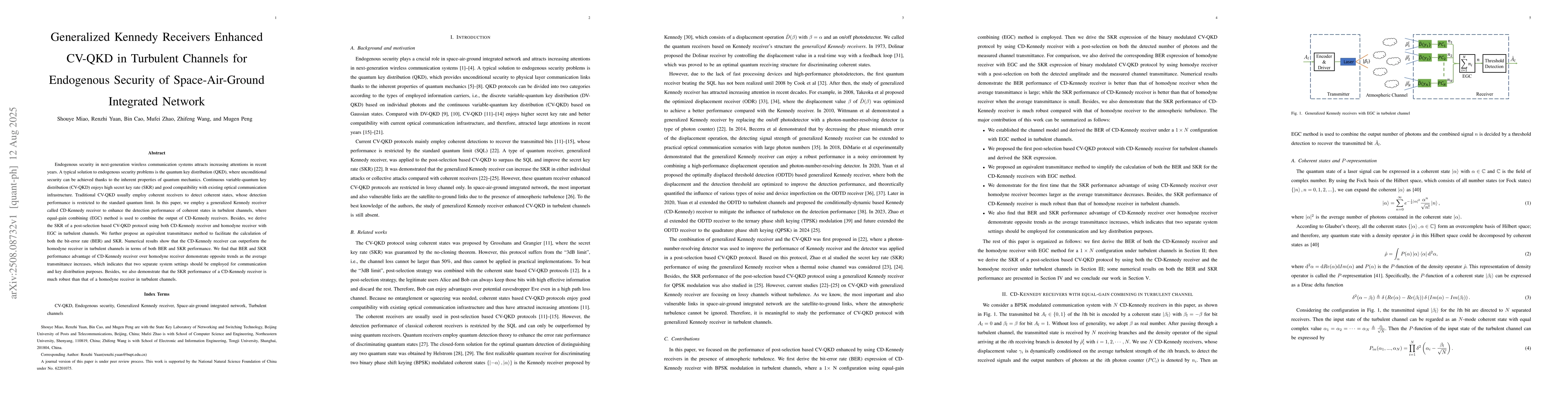 Endogenous security in next-generation wireless communication systems attracts increasing attentions in recent years. A typical solution to endogenous security problems is the quantum key distribution (QKD), where unconditional security can be achieved thanks to the inherent properties of quantum mechanics. Continuous variable-quantum key distribution (CV-QKD) enjoys high secret key rate (SKR) and good compatibility with existing optical communication infrastructure. Traditional CV-QKD usually employ coherent receivers to detect coherent states, whose detection performance is restricted to the standard quantum limit. In this paper, we employ a generalized Kennedy receiver called CD-Kennedy receiver to enhance the detection performance of coherent states in turbulent channels, where equal-gain combining (EGC) method is used to combine the output of CD-Kennedy receivers. Besides, we derive the SKR of a post-selection based CV-QKD protocol using both CD-Kennedy receiver and homodyne receiver with EGC in turbulent channels. We further propose an equivalent transmittance method to facilitate the calculation of both the bit-error rate (BER) and SKR. Numerical results show that the CD-Kennedy receiver can outperform the homodyne receiver in turbulent channels in terms of both BER and SKR performance. We find that BER and SKR performance advantage of CD-Kennedy receiver over homodyne receiver demonstrate opposite trends as the average transmittance increases, which indicates that two separate system settings should be employed for communication and key distribution purposes. Besides, we also demonstrate that the SKR performance of a CD-Kennedy receiver is much robust than that of a homodyne receiver in turbulent channels.