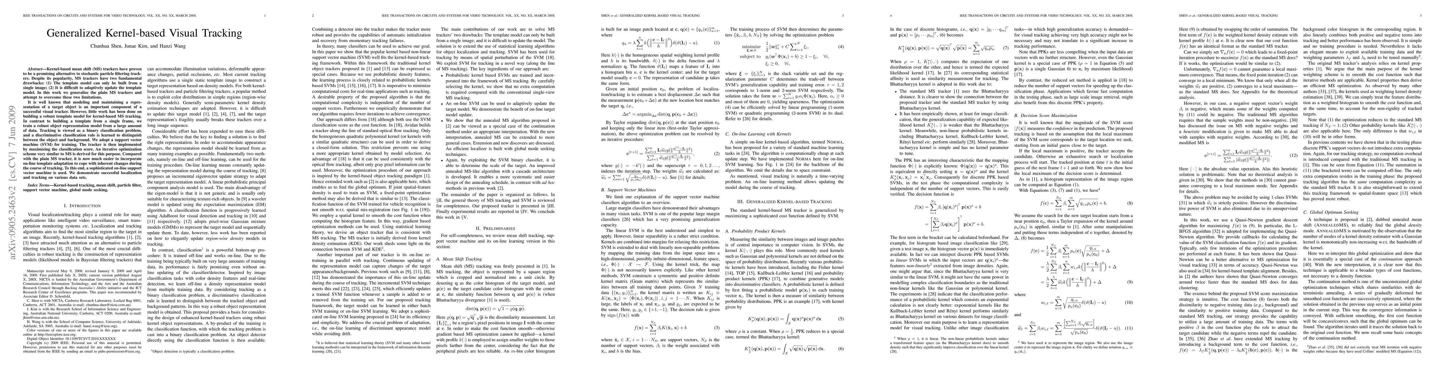 In this work we generalize the plain MS trackers and attempt to overcome standard mean shift trackers' two limitations. It is well known that modeling and maintaining a representation of a target object is an important component of a successful visual tracker. However, little work has been done on building a robust template model for kernel-based MS tracking. In contrast to building a template from a single frame, we train a robust object representation model from a large amount of data. Tracking is viewed as a binary classification problem, and a discriminative classification rule is learned to distinguish between the object and background. We adopt a support vector machine (SVM) for training. The tracker is then implemented by maximizing the classification score. An iterative optimization scheme very similar to MS is derived for this purpose.