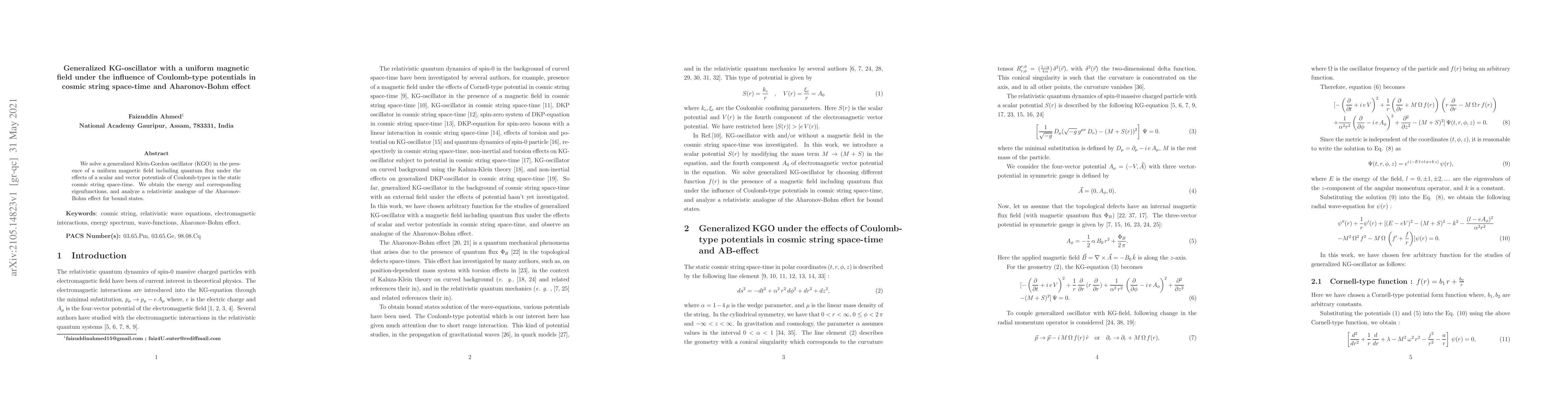 This paper investigates a generalized Klein-Gordon oscillator in cosmic string space-time under uniform magnetic fields and Coulomb-type potentials, determining energy eigenvalues and eigenfunctions. It also examines the relativistic Aharonov-Bohm effect for bound states.