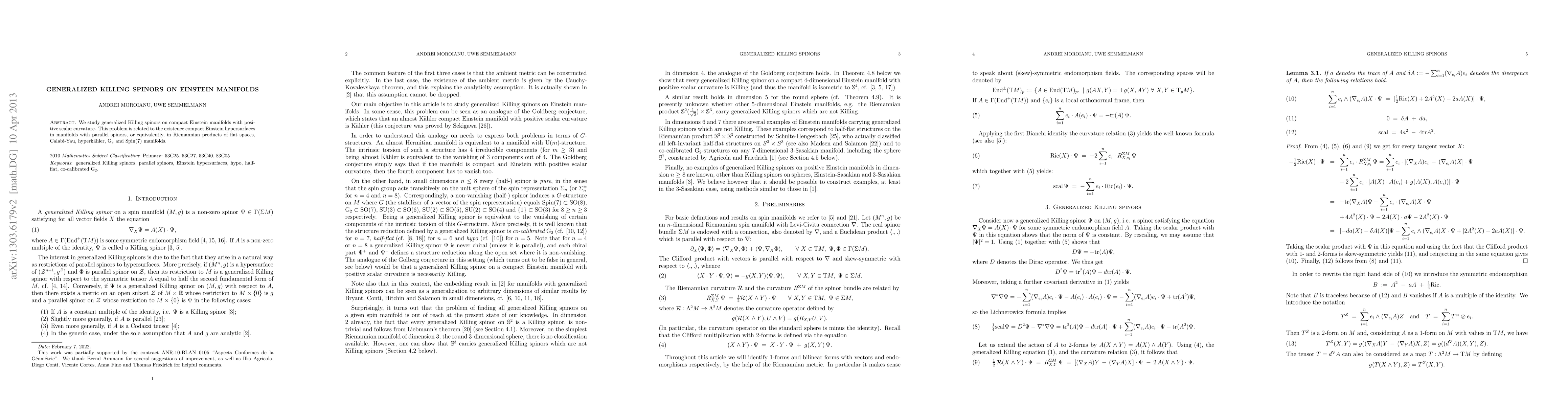 We study generalized Killing spinors on compact Einstein manifolds with positive scalar curvature. This problem is related to the existence compact Einstein hypersurfaces in manifolds with parallel spinors, or equivalently, in Riemannian products of flat spaces, Calabi-Yau, hyperkaehler, G_2 and Spin(7) manifolds.