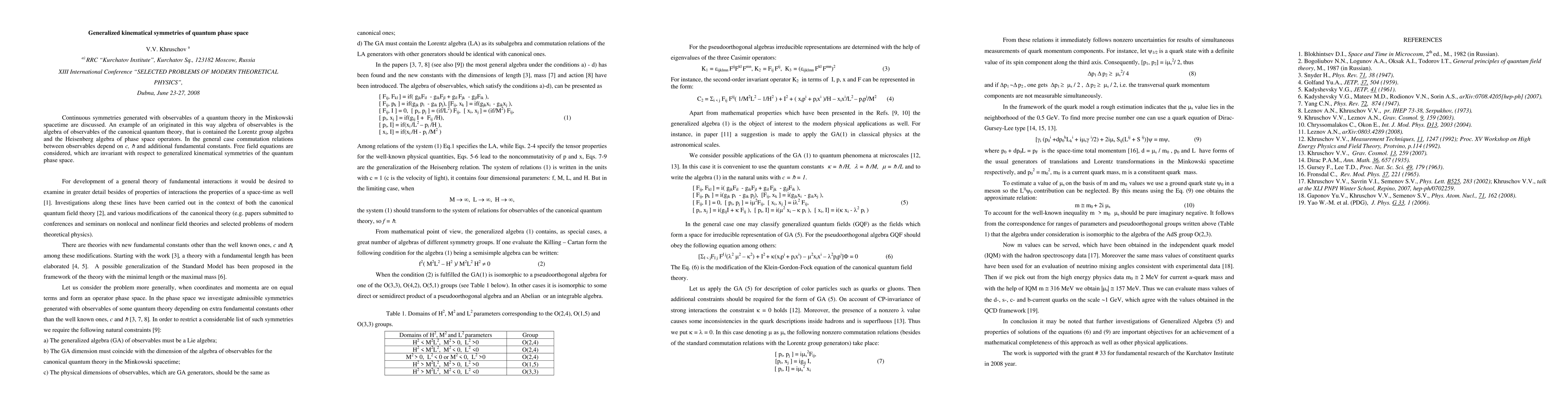 The research discusses generalized kinematical symmetries of quantum phase space, focusing on continuous symmetries generated by observables in Minkowski spacetime. It explores algebras of observables, including the canonical quantum theory algebra and Lorentz group algebra, with commutation relations dependent on c, h, and other fundamental constants.