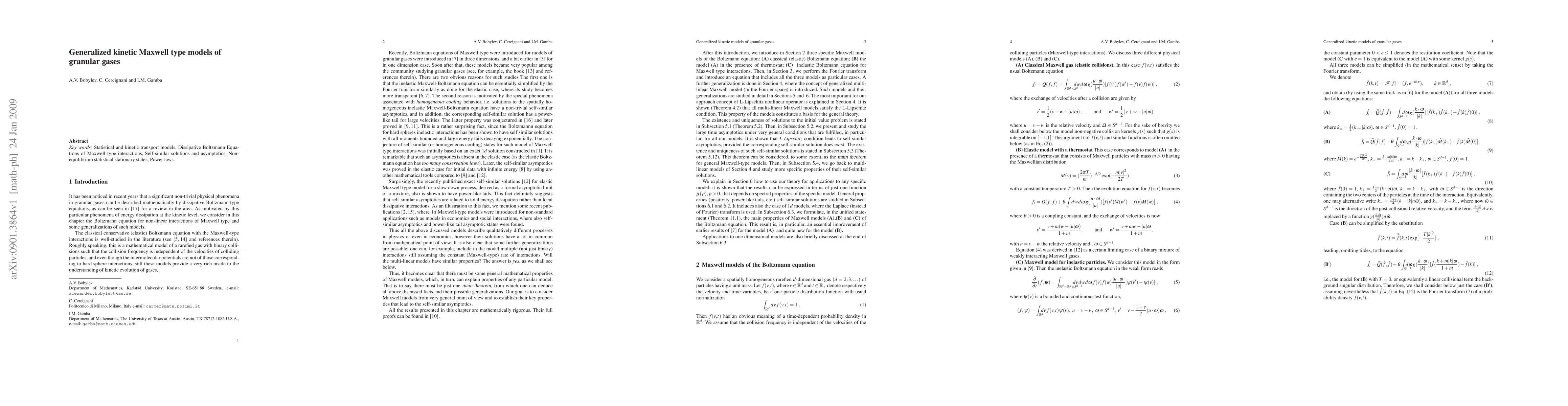 This paper generalizes kinetic Maxwell type models for granular gases, focusing on Boltzmann equations for both elastic and inelastic interactions. The study develops a framework using characteristic functions and proves the existence of self-similar solutions, revealing stable equilibrium states with power tails.