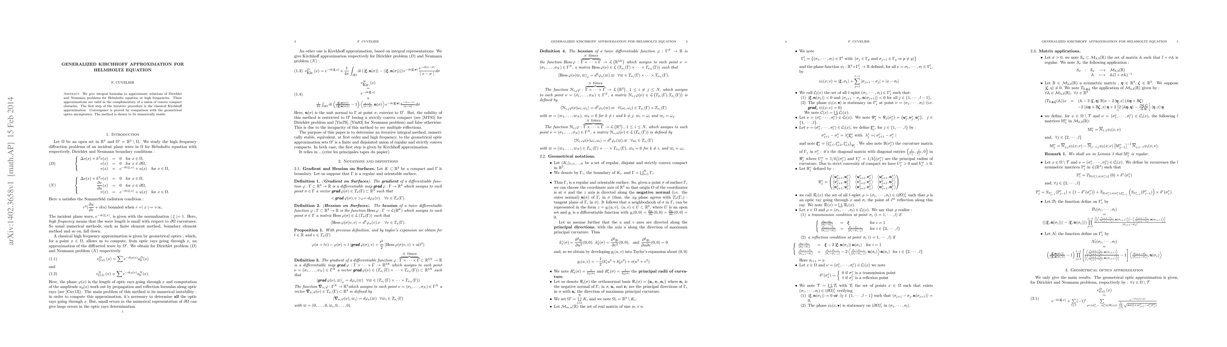 This research presents integral formulas to approximate Helmholtz equation solutions for high-frequency Dirichlet and Neumann problems, valid outside convex obstacle unions. It builds on the Kirchhoff approximation, proves convergence via geometrical optics asymptotics comparison, and demonstrates numerical stability.