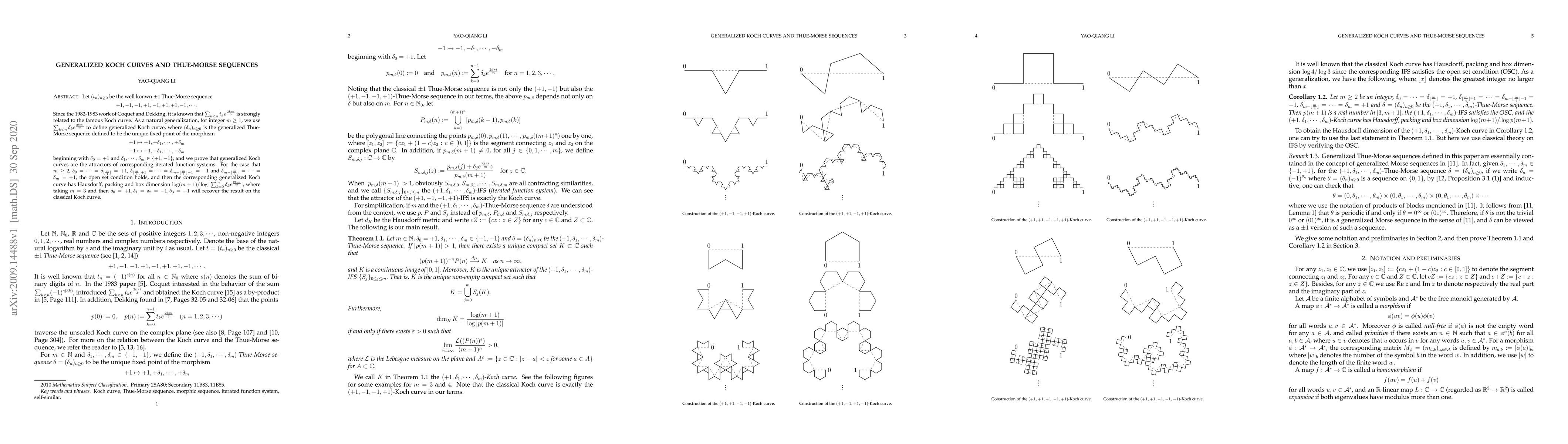 This paper generalizes the Koch curve using the Thue-Morse sequence, defining generalized Koch curves through iterated function systems. It proves these curves are attractors and derives their dimensions, recovering the classical Koch curve when $m=3$.