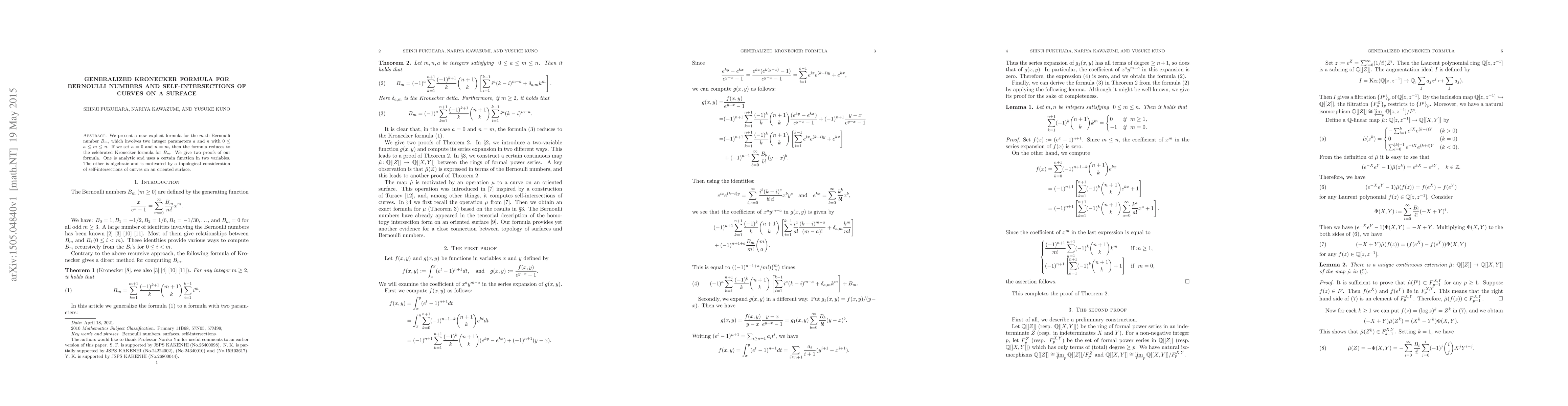 We present a new explicit formula for the $m$-th Bernoulli number $B_m$, which involves two integer parameters $a$ and $n$ with $0\le a\le m\le n$. If we set $a=0$ and $n=m$, then the formula reduces to the celebrated Kronecker formula for $B_m$. We give two proofs of our formula. One is analytic and uses a certain function in two variables. The other is algebraic and is motivated by a topological consideration of self-intersections of curves on an oriented surface.