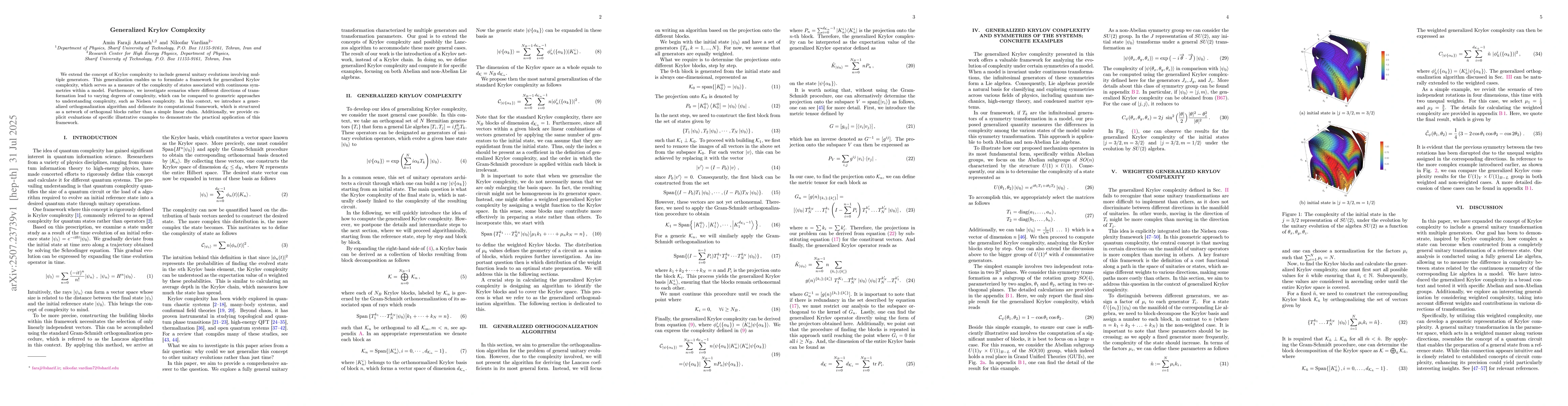We extend the concept of Krylov complexity to include general unitary evolutions involving multiple generators. This generalization enables us to formulate a framework for generalized Krylov complexity, which serves as a measure of the complexity of states associated with continuous symmetries within a model. Furthermore, we investigate scenarios where different directions of transformation lead to varying degrees of complexity, which can be compared to geometric approaches to understanding complexity, such as Nielsen complexity. In this context, we introduce a generalized orthogonalization algorithm and delineate its computational framework, which is structured as a network of orthogonal blocks rather than a simple linear chain. Additionally, we provide explicit evaluations of specific illustrative examples to demonstrate the practical application of this framework.