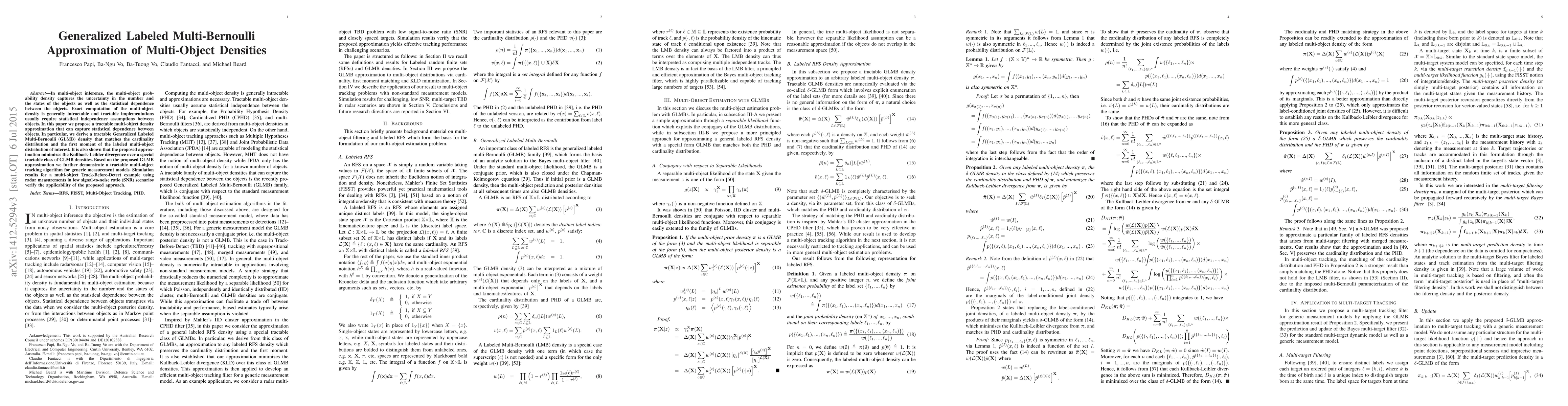 This paper proposes a Generalized Labeled Multi-Bernoulli (GLMB) approximation for multi-object densities that captures statistical dependence between objects, minimizing the Kullback-Leibler divergence. The approach enables a practical multi-object tracking algorithm validated through simulations in low SNR radar scenarios.