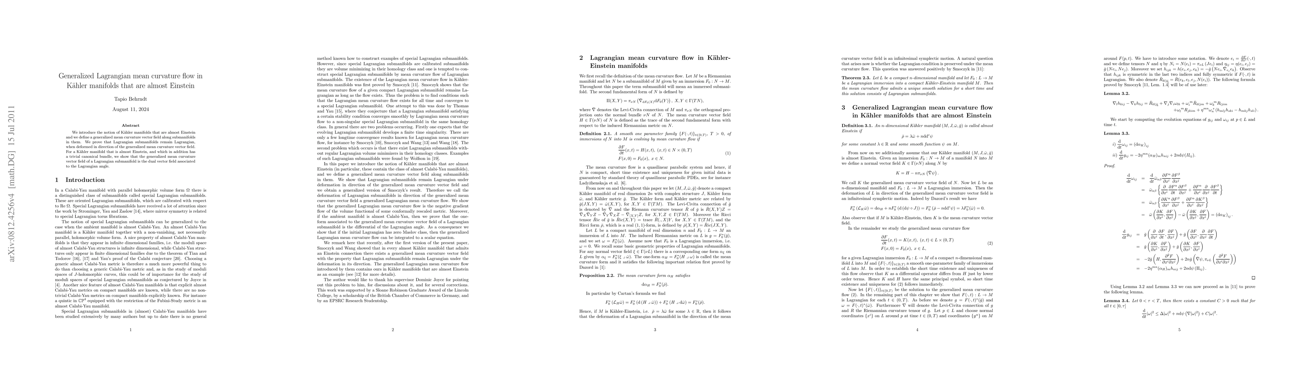 This paper introduces Kähler manifolds that are almost Einstein and defines a generalized mean curvature vector field. It proves that Lagrangian submanifolds remain Lagrangian under this flow and shows that for such manifolds with a trivial canonical bundle, the generalized mean curvature vector field corresponds to the dual vector field associated with the Lagrangian angle.