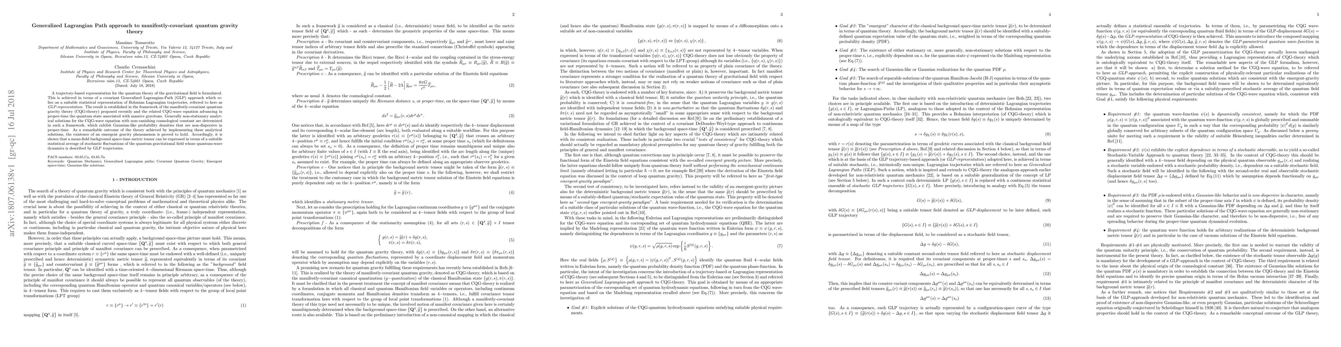 This paper develops a trajectory-based, manifestly-covariant quantum gravity theory using a Generalized Lagrangian-Path approach, showing that it yields analytical solutions with Gaussian-like, non-dispersive probability densities. It proves an emergent gravity phenomenon, where a mean-field space-time metric tensor arises from quantum gravitational field fluctuations.