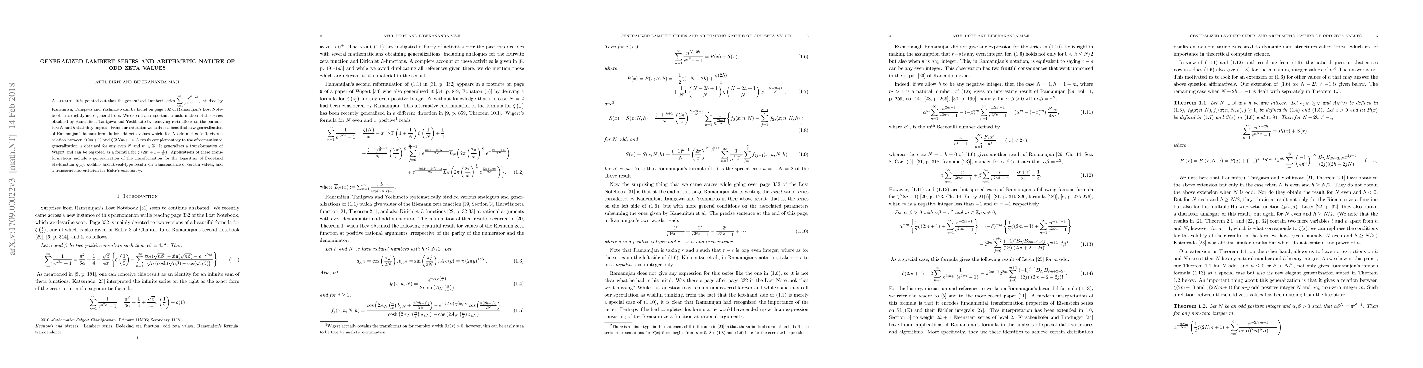 It is pointed out that the generalized Lambert series $\displaystyle\sum_{n=1}^{\infty}\frac{n^{N-2h}}{e^{n^{N}x}-1}$ studied by Kanemitsu, Tanigawa and Yoshimoto can be found on page $332$ of Ramanujan's Lost Notebook in a slightly more general form. We extend an important transformation of this series obtained by Kanemitsu, Tanigawa and Yoshimoto by removing restrictions on the parameters $N$ and $h$ that they impose. From our extension we deduce a beautiful new generalization of Ramanujan's famous formula for odd zeta values which, for $N$ odd and $m>0$, gives a relation between $\zeta(2m+1)$ and $\zeta(2Nm+1)$. A result complementary to the aforementioned generalization is obtained for any even $N$ and $m\in\mathbb{Z}$. It generalizes a transformation of Wigert and can be regarded as a formula for $\zeta\left(2m+1-\frac{1}{N}\right)$. Applications of these transformations include a generalization of the transformation for the logarithm of Dedekind eta-function $\eta(z)$, Zudilin- and Rivoal-type results on transcendence of certain values, and a transcendence criterion for Euler's constant $\gamma$.