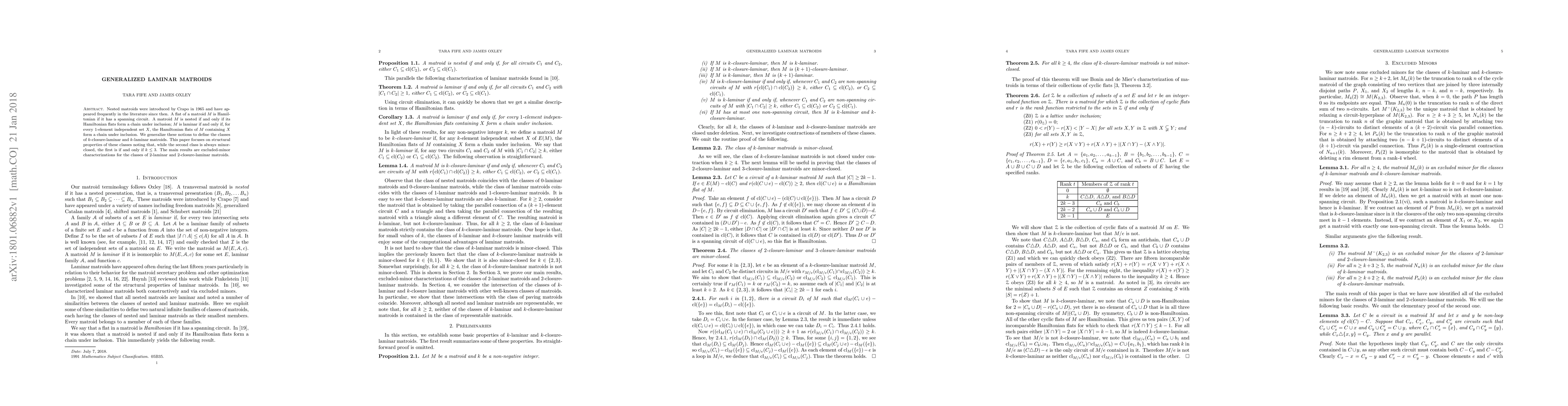 Nested matroids were introduced by Crapo in 1965 and have appeared frequently in the literature since then. A flat of a matroid $M$ is Hamiltonian if it has a spanning circuit. A matroid $M$ is nested if and only if its Hamiltonian flats form a chain under inclusion; $M$ is laminar if and only if, for every $1$-element independent set $X$, the Hamiltonian flats of $M$ containing $X$ form a chain under inclusion. We generalize these notions to define the classes of $k$-closure-laminar and $k$-laminar matroids. This paper focuses on structural properties of these classes noting that, while the second class is always minor-closed, the first is if and only if $k \le 3$. The main results are excluded-minor characterizations for the classes of 2-laminar and 2-closure-laminar matroids.
