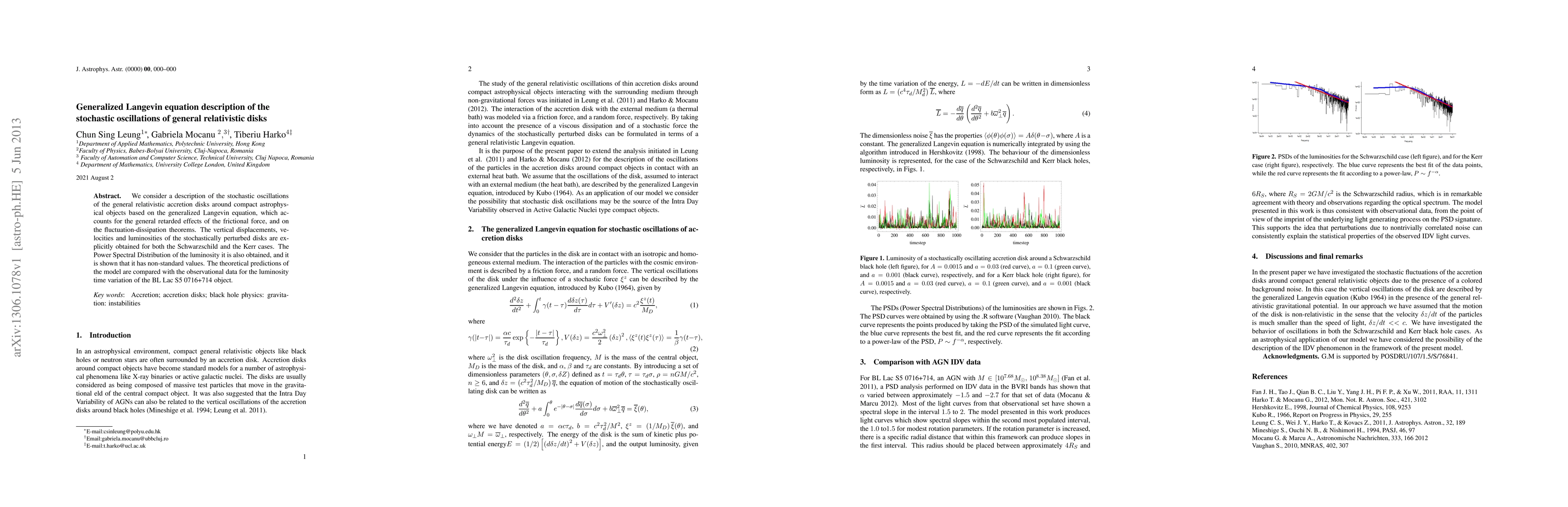 This paper uses a generalized Langevin equation to model the stochastic oscillations in general relativistic accretion disks, deriving vertical displacements, velocities, and luminosities for both Schwarzschild and Kerr cases. It finds non-standard values in the Power Spectral Distribution of luminosity and compares theoretical predictions with observational data from the BL Lac S5 0716+714 object.