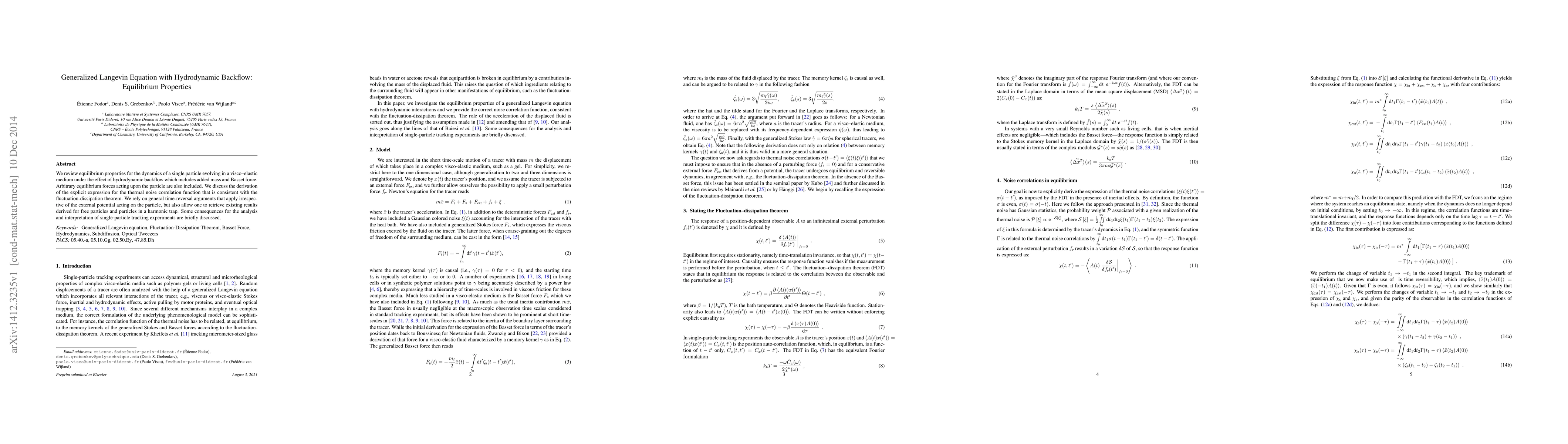 We review equilibrium properties for the dynamics of a single particle evolving in a visco--elastic medium under the effect of hydrodynamic backflow which includes added mass and Basset force. Arbitrary equilibrium forces acting upon the particle are also included. We discuss the derivation of the explicit expression for the thermal noise correlation function that is consistent with the fluctuation-dissipation theorem. We rely on general time-reversal arguments that apply irrespective of the external potential acting on the particle, but also allow one to retrieve existing results derived for free particles and particles in a harmonic trap. Some consequences for the analysis and interpretation of single-particle tracking experiments are briefly discussed.