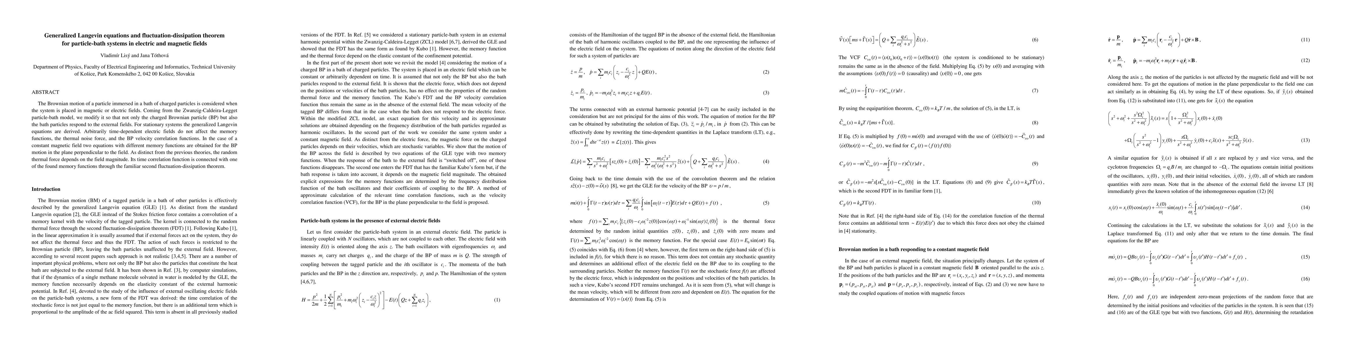 This paper modifies the Zwanzig-Caldeira-Legget particle-bath model to account for the effects of electric and magnetic fields on both Brownian and bath particles. The study derives generalized Langevin equations for stationary systems, showing that time-dependent electric fields do not affect memory functions, while constant magnetic fields lead to distinct memory functions for particle motion perpendicular to the field, with thermal force dependence on field magnitude.