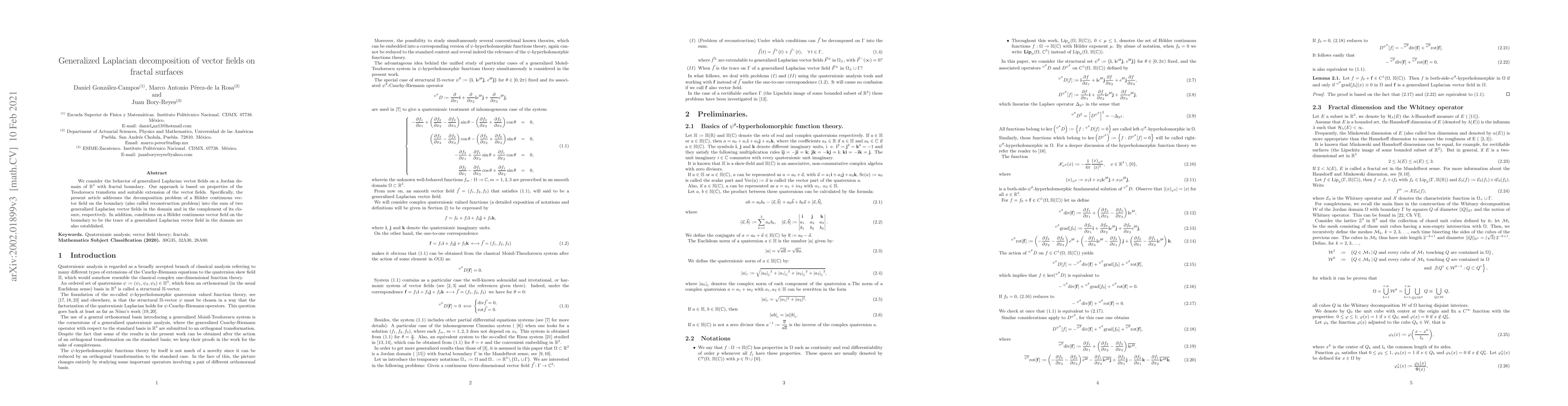 We consider the behavior of generalized Laplacian vector fields on a Jordan domain of $\mathbb{R}^{3}$ with fractal boundary. Our approach is based on properties of the Teodorescu transform and suitable extension of the vector fields. Specifically, the present article addresses the decomposition problem of a H\"older continuous vector field on the boundary (also called reconstruction problem) into the sum of two generalized Laplacian vector fields in the domain and in the complement of its closure, respectively. In addition, conditions on a H\"older continuous vector field on the boundary to be the trace of a generalized Laplacian vector field in the domain are also established.