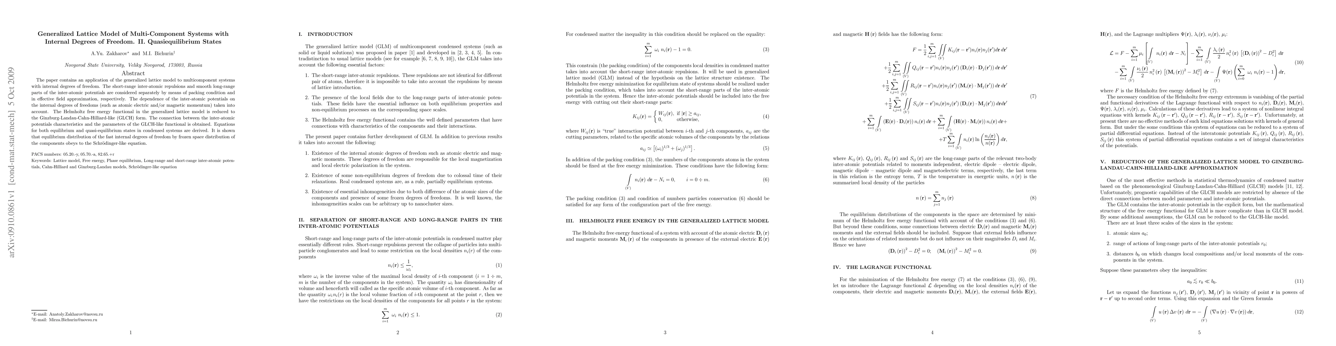 The paper contains an application of the generalized lattice model to multicomponent systems with internal degrees of freedom. The short-range inter-atomic repulsions and smooth long-range parts of the inter-atomic potentials are considered separately by means of packing condition and in effective field approximation, respectively. The dependence of the inter-atomic potentials on the internal degrees of freedoms (such as atomic electric and/or magnetic momentum) taken into account. The Helmholtz free energy functional in the generalized lattice model is reduced to the Ginzburg-Landau-Cahn-Hilliard-like form. The connection between the inter-atomic potentials characteristics and the parameters of the GLCH-like functional is obtained. Equations for both equilibrium and quasi-equilibrium states in condensed systems are derived. It is shown that equilibrium distribution of the fast internal degrees of freedom by frozen space distribution of the components obeys to the Schroedinger-like equation.