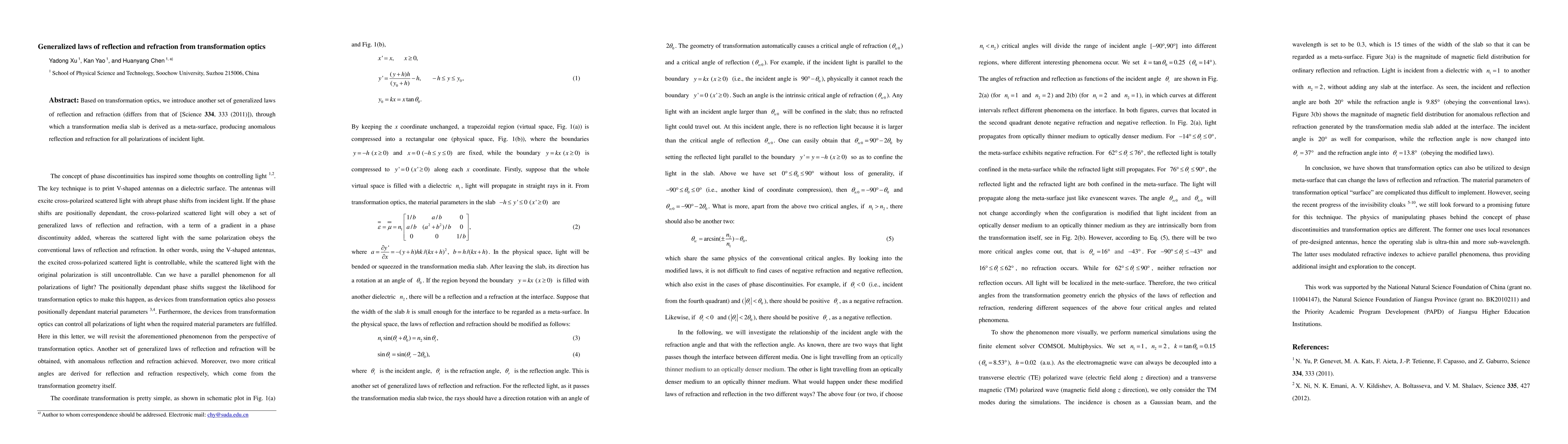 Summary: This paper proposes a new set of generalized laws of reflection and refraction using transformation optics, deriving a meta-surface that induces anomalous reflection and refraction for various light polarizations. It differs from previously established laws as highlighted in a 2011 Science publication.