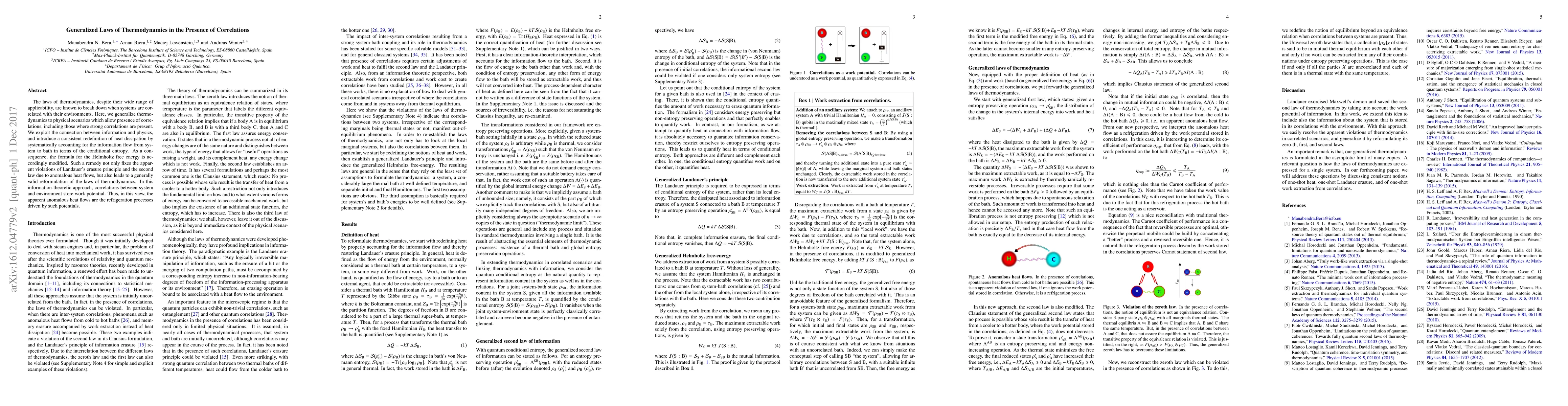 This paper generalizes the laws of thermodynamics to account for correlations between systems and their environments, redefining heat dissipation through conditional entropy and modifying the Helmholtz free energy formula. This approach resolves violations of Landauer's principle and the second law, showing that correlations store work potential and anomalous heat flows are refrigeration processes.