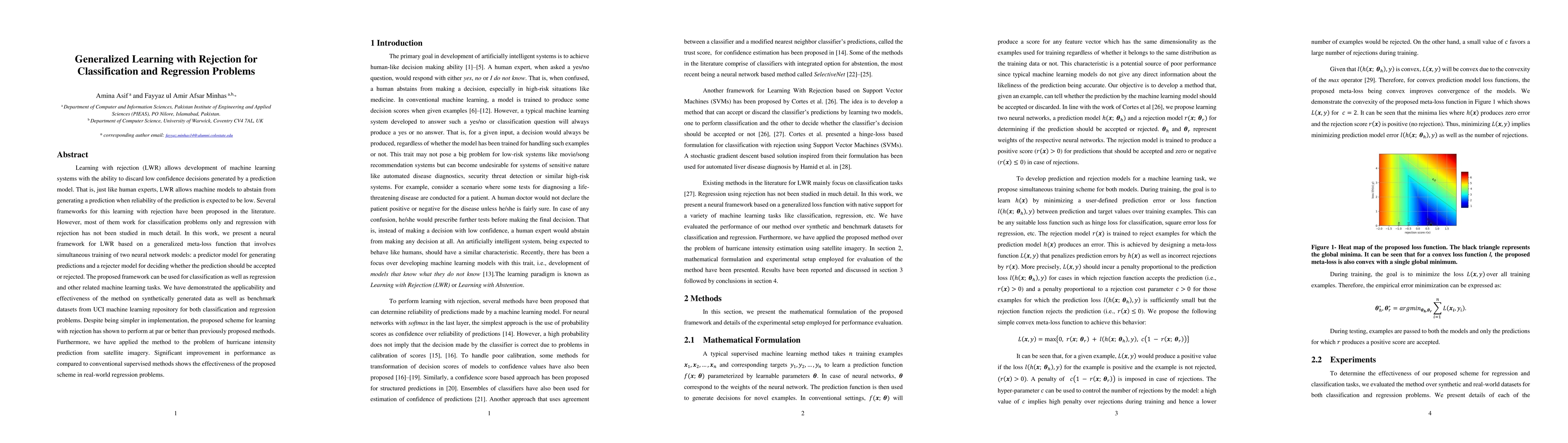 This paper introduces a neural framework for learning with rejection (LWR) that can handle both classification and regression tasks. The framework employs a meta-loss function to train two neural networks: one for predictions and one for deciding whether to accept or reject predictions, thereby enabling the model to abstain when confidence is low. The method demonstrates comparable or superior performance to existing methods on synthetic and benchmark datasets, and shows significant improvement in real-world hurricane intensity prediction.