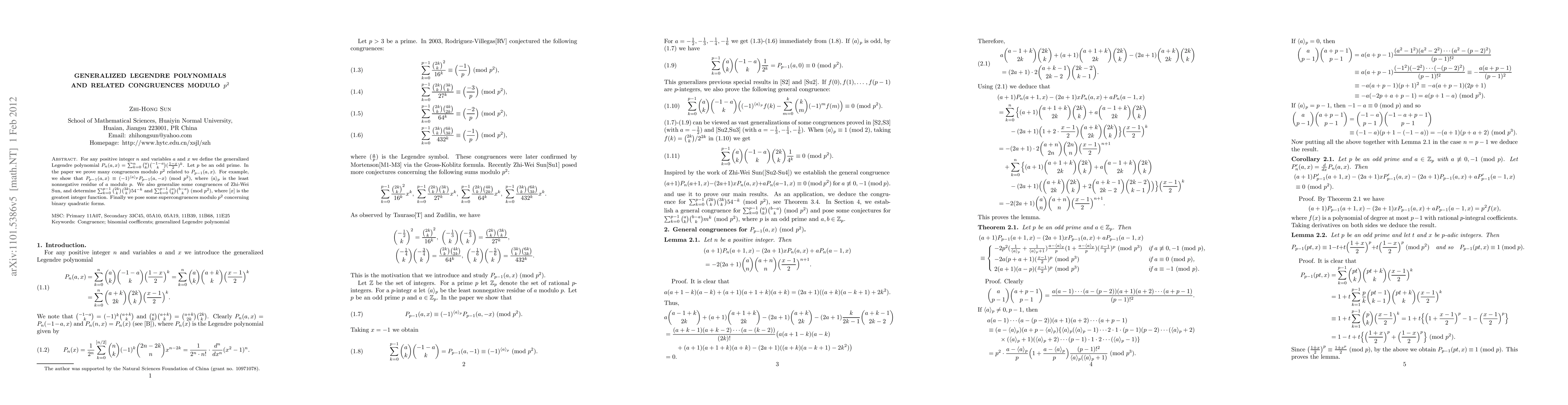 For any positive integer $n$ and variables $a$ and $x$ we define the generalized Legendre polynomial $P_n(a,x)=\sum_{k=0}^n\b ak\b{-1-a}k(\frac{1-x}2)^k$. Let $p$ be an odd prime. In the paper we prove many congruences modulo $p^2$ related to $P_{p-1}(a,x)$. For example, we show that $P_{p-1}(a,x)\e (-1)^{_p}P_{p-1}(a,-x)\mod {p^2}$, where $_p$ is the least nonnegative residue of $a$ modulo $p$. We also generalize some congruences of Zhi-Wei Sun, and determine $\sum_{k=0}^{p-1}\binom{2k}k\binom{3k}k{54^{-k}}$ and $\sum_{k=0}^{p-1}\binom ak\binom{b-a}k\mod {p^2}$, where $[x]$ is the greatest integer function. Finally we pose some supercongruences modulo $p^2$ concerning binary quadratic forms.