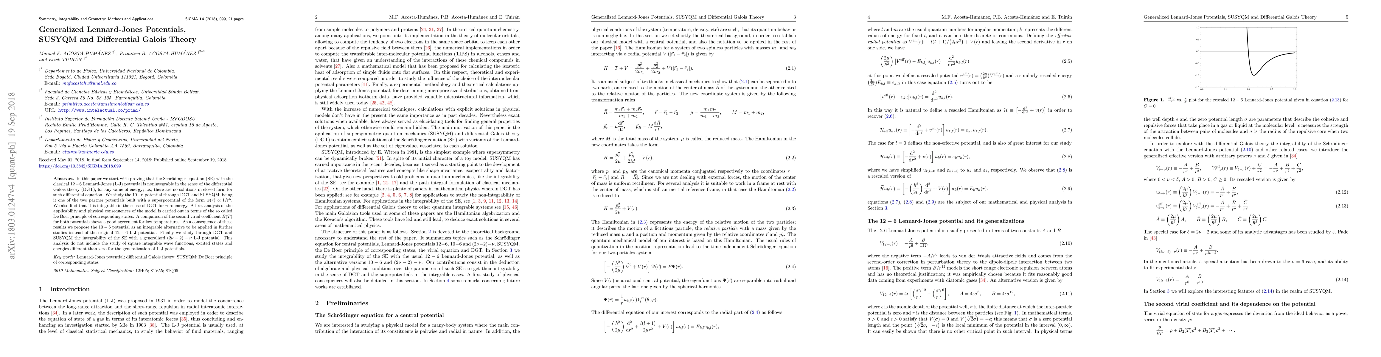 In this paper we start with proving that the Schr\"odinger equation (SE) with the classical $12-6$ Lennard-Jones (L-J) potential is nonintegrable in the sense of the differential Galois theory (DGT), for any value of energy; i.e., there are no solutions in closed form for such differential equation. We study the $10-6$ potential through DGT and SUSYQM; being it one of the two partner potentials built with a superpotential of the form $w(r)\propto 1/r^5$. We also find that it is integrable in the sense of DGT for zero energy. A first analysis of the applicability and physical consequences of the model is carried out in terms of the so called De Boer principle of corresponding states. A comparison of the second virial coefficient $B(T)$ for both potentials shows a good agreement for low temperatures. As a consequence of these results we propose the $10-6$ potential as an integrable alternative to be applied in further studies instead of the original $12-6$ L-J potential. Finally we study through DGT and SUSYQM the integrability of the SE with a generalized $(2\nu-2)-\nu$ L-J potential. This analysis do not include the study of square integrable wave functions, excited states and energies different than zero for the generalization of L-J potentials.