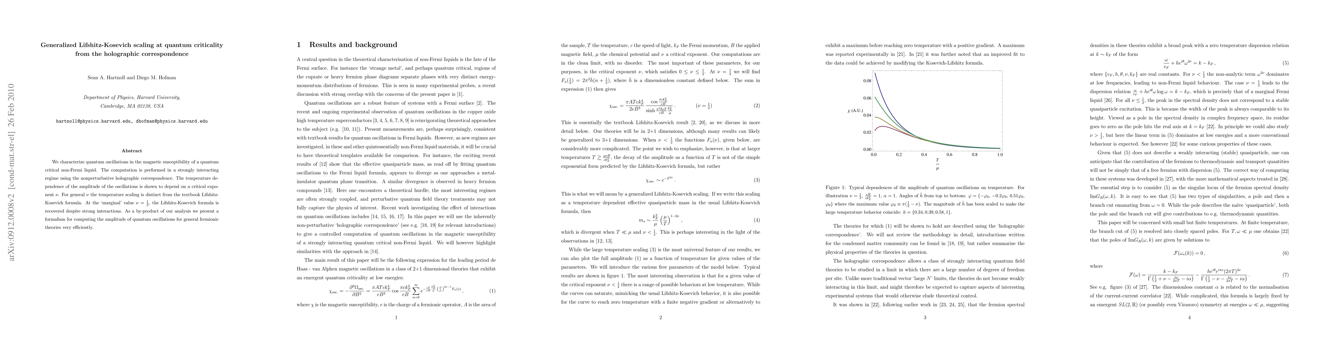 We characterize quantum oscillations in the magnetic susceptibility of a quantum critical non-Fermi liquid. The computation is performed in a strongly interacting regime using the nonperturbative holographic correspondence. The temperature dependence of the amplitude of the oscillations is shown to depend on a critical exponent nu. For general nu the temperature scaling is distinct from the textbook Lifshitz-Kosevich formula. At the `marginal' value nu = 1/2, the Lifshitz-Kosevich formula is recovered despite strong interactions. As a by-product of our analysis we present a formalism for computing the amplitude of quantum oscillations for general fermionic theories very efficiently.