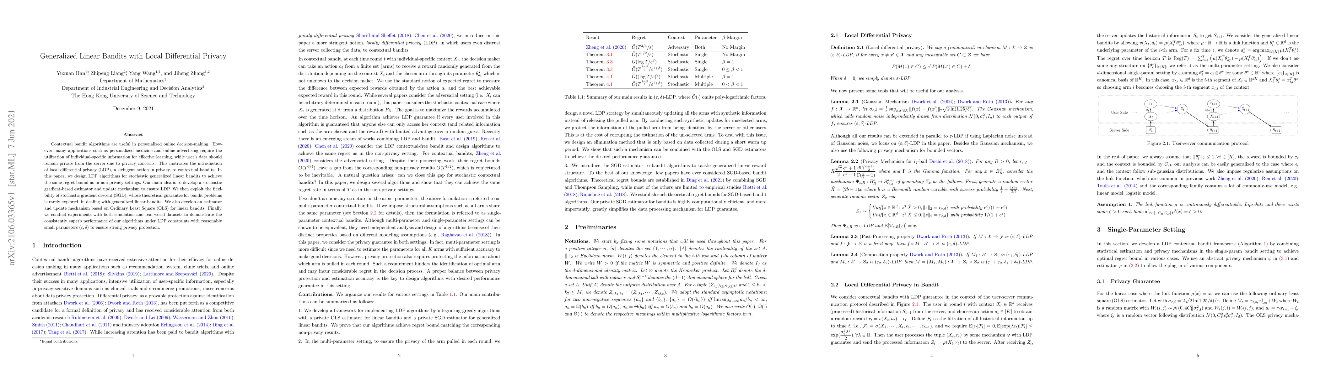 This paper introduces local differential privacy (LDP) algorithms for stochastic generalized linear bandits, ensuring the same regret bounds as in non-privacy settings while protecting user data privacy. The authors develop a stochastic gradient-based estimator and update mechanism, leveraging the flexibility of stochastic gradient descent, and demonstrate superior performance through simulations and real-world datasets.