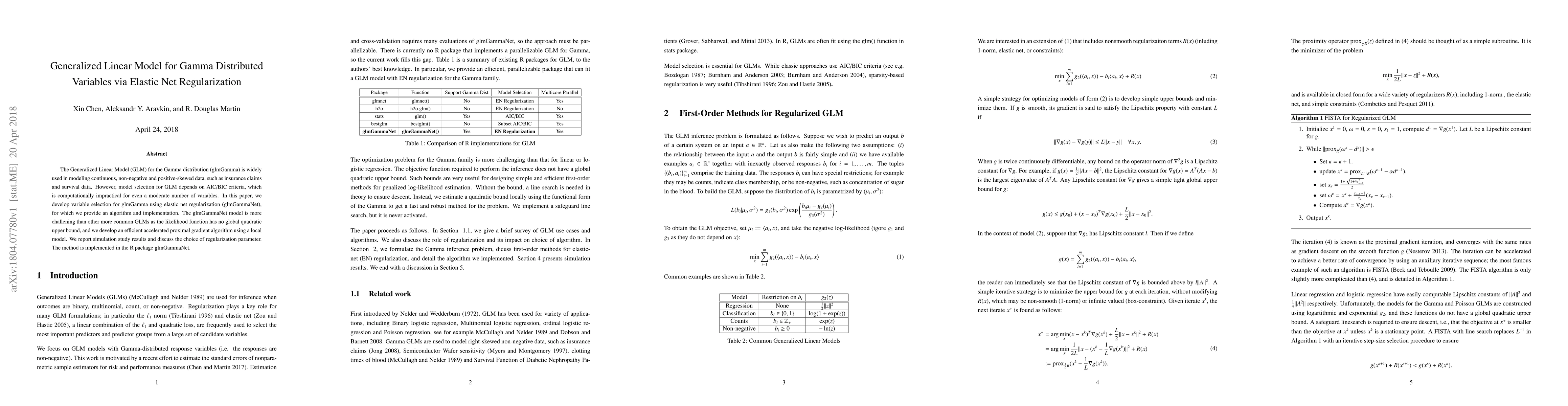 This paper develops an elastic net regularization method for Generalized Linear Models (GLM) for Gamma distributed variables, introducing an efficient algorithm to address the computational challenges of model selection. The proposed glmGammaNet model is implemented in an R package and evaluated through simulation studies.